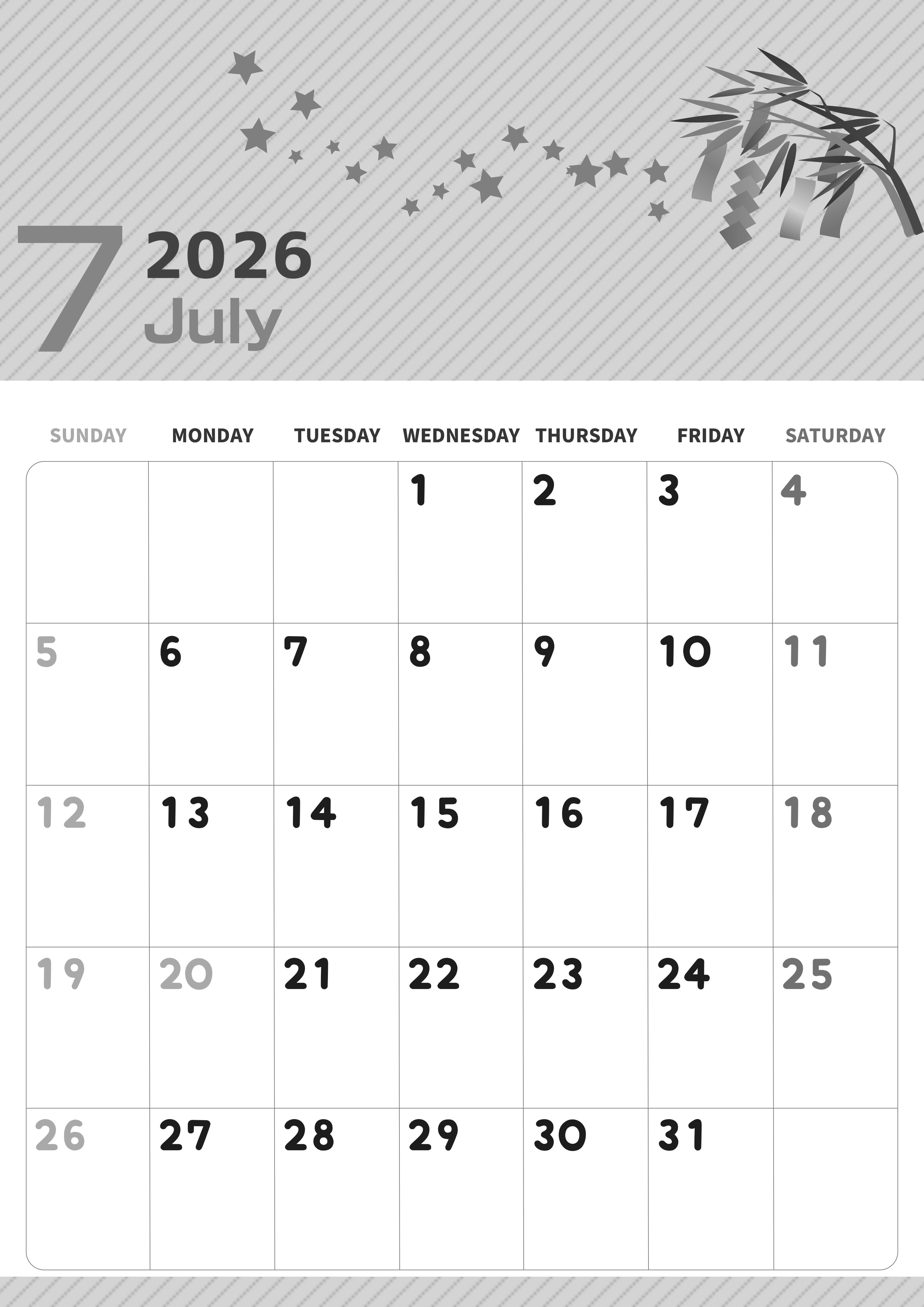 2026年7月縦型モノクロの日曜始まりの無料テンプレート白黒カレンダーです。無料で使える白黒カレンダーでありながらも天の川のイラストがかわいい使うのが楽しくなるようなフリー素材です。A4サイズで汎用性も高いです。(2026-00350710)