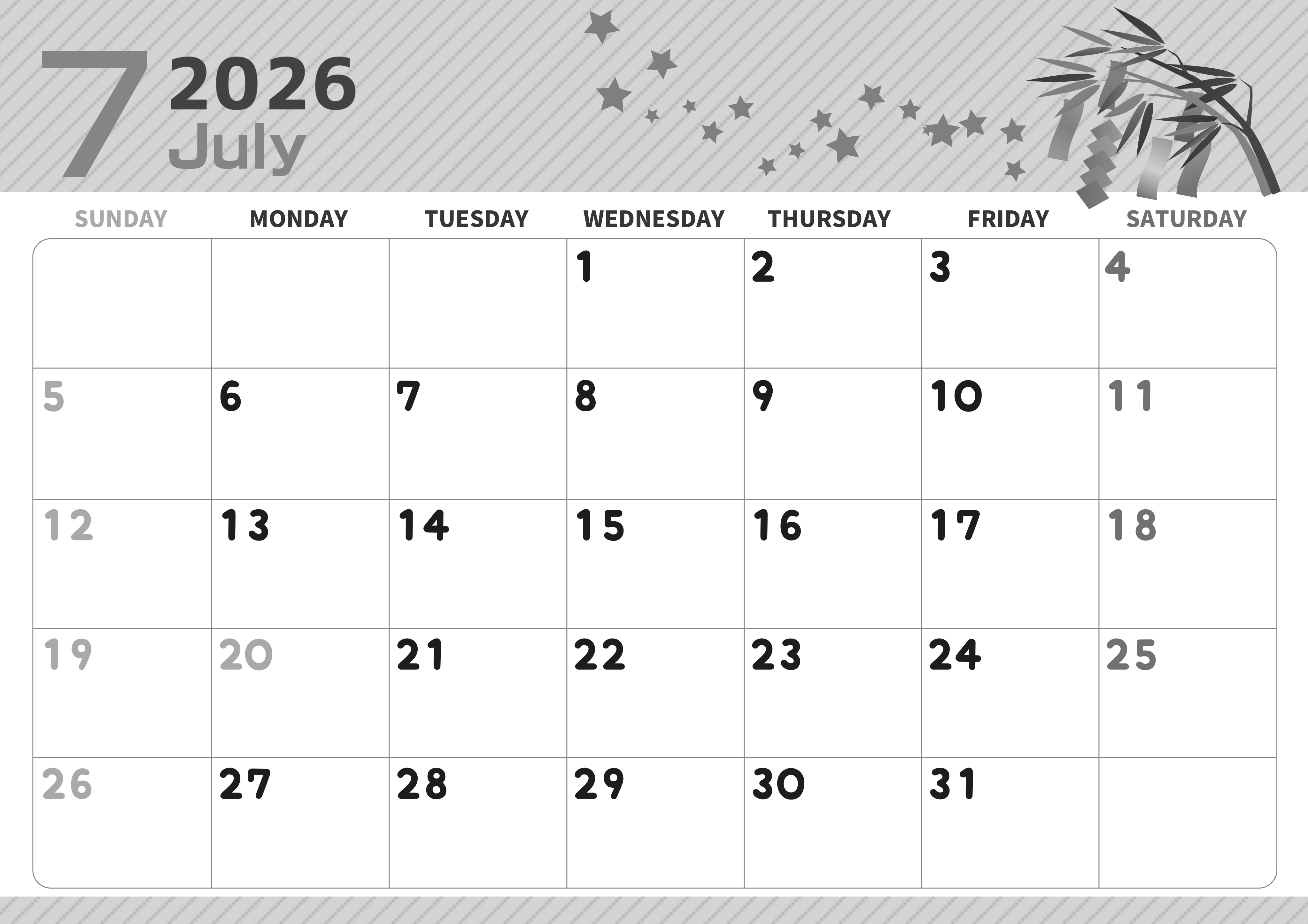 2026年7月横型モノクロの日曜始まりの無料テンプレート白黒カレンダーです。短冊に向かって天の川を織りなす星がちりばめられているかわいいイラスト白黒カレンダーです。曜日ごとに文字の色分けが施されているのでタスク管理しやすいです。(2026-00350700)