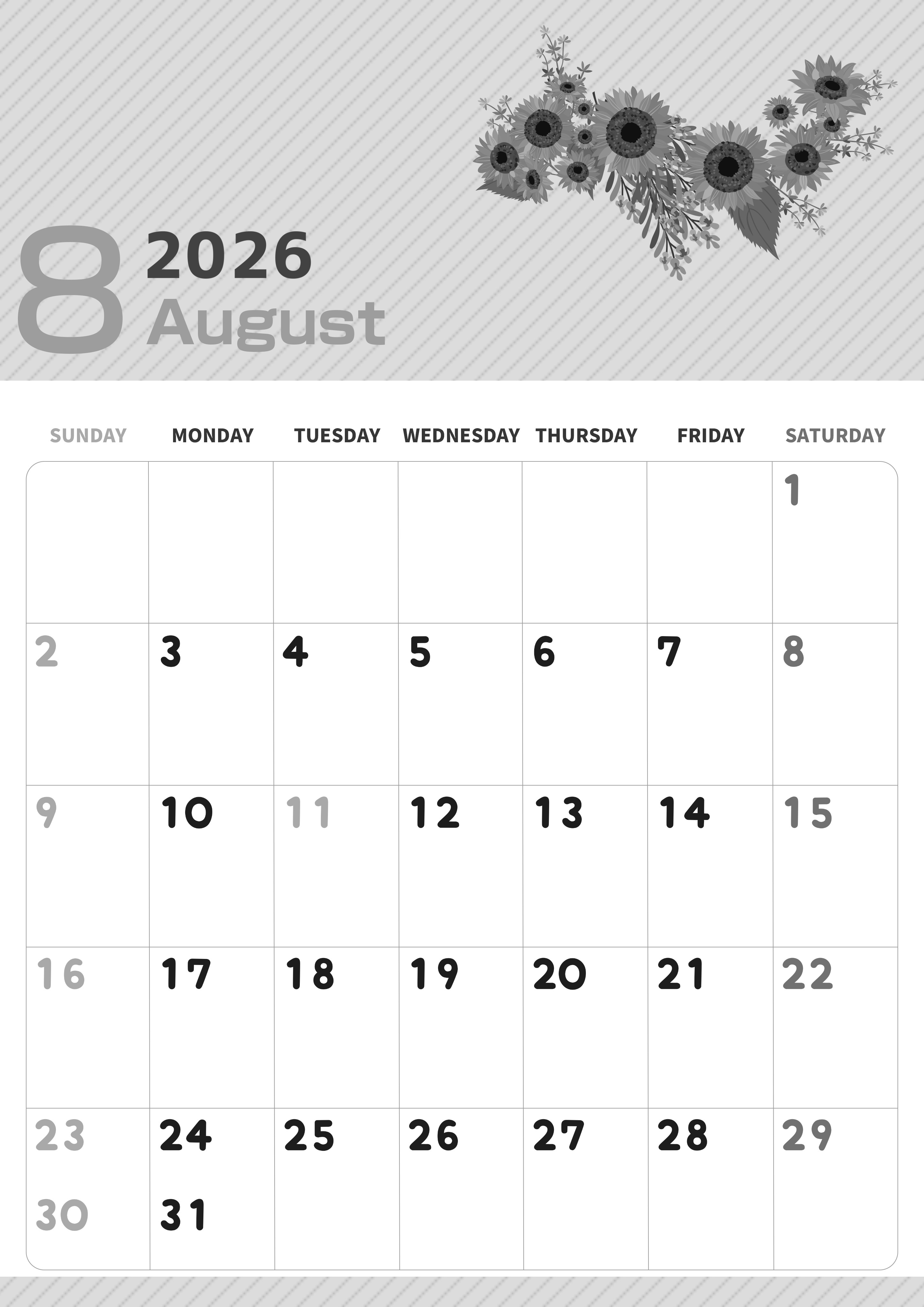 2026年8月縦型モノクロの日曜始まり 向日葵のイラストがかわいいA4無料白黒カレンダー(2026-00350810)