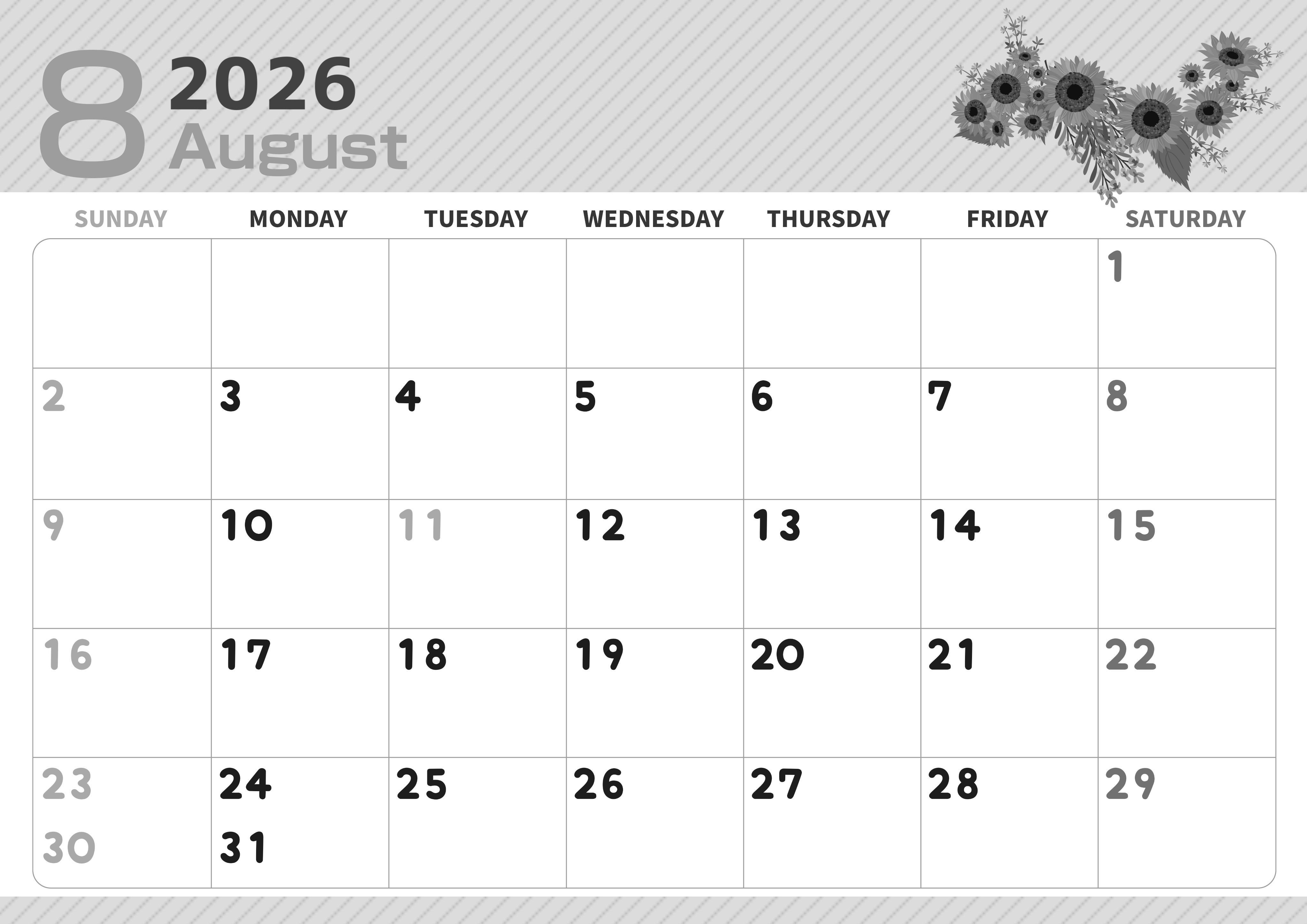 2026年8月横型モノクロの日曜始まりの無料テンプレート白黒カレンダーです。大きく元気に育った向日葵が右上に丁寧に描かれているかわいいテイストの白黒カレンダーです。イラスト部分と予定記入部分のコントラストがはっきりしています。(2026-00350800)
