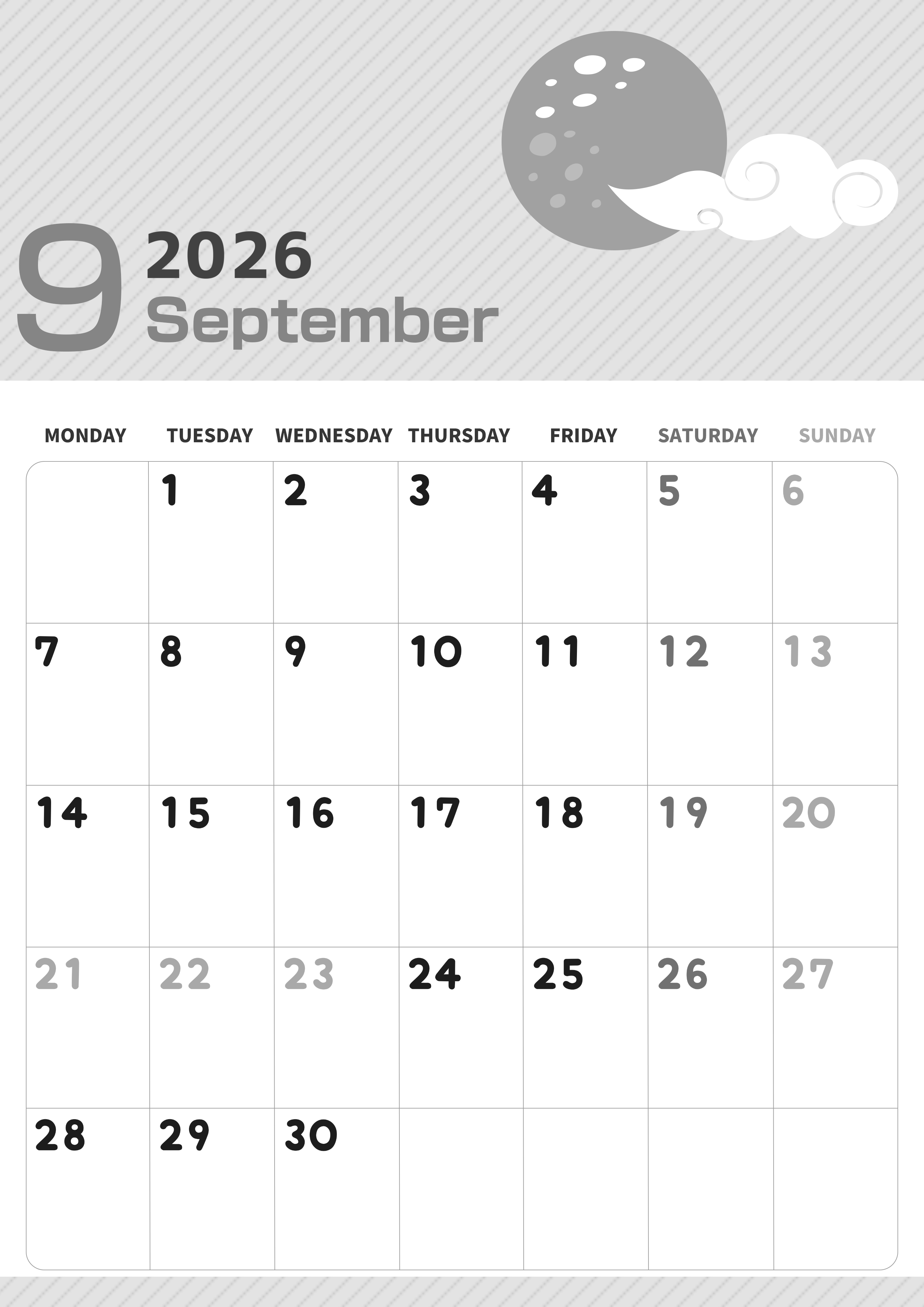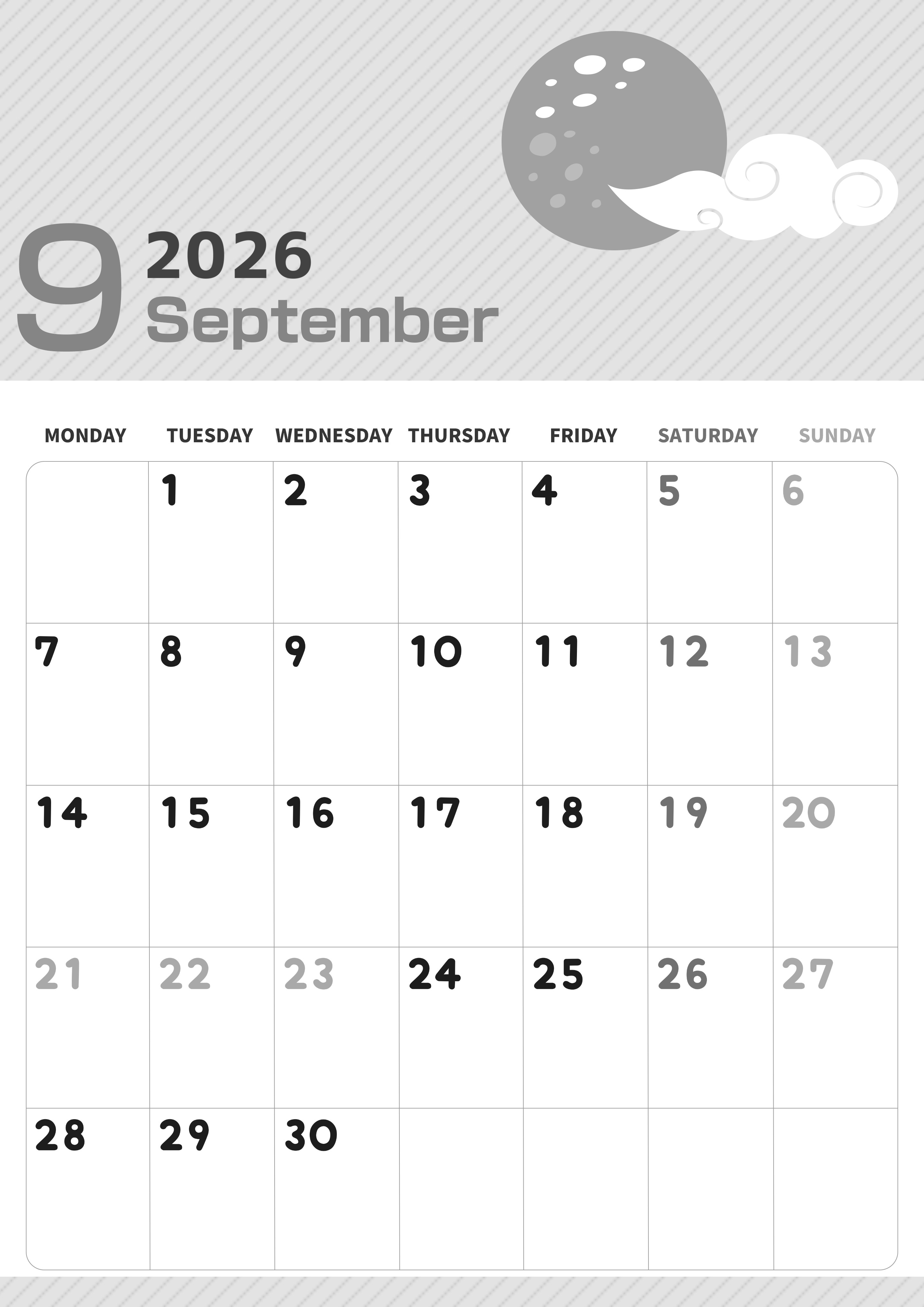 2026年9月縦型モノクロの月曜始まりの無料テンプレート白黒カレンダーです。満月のイラストがワンポイントです。かわいい要素が強すぎず月曜始まりで罫線もくっきりと引かれているので実用性が高い多忙な人向けとなっています。(2026-00350911)