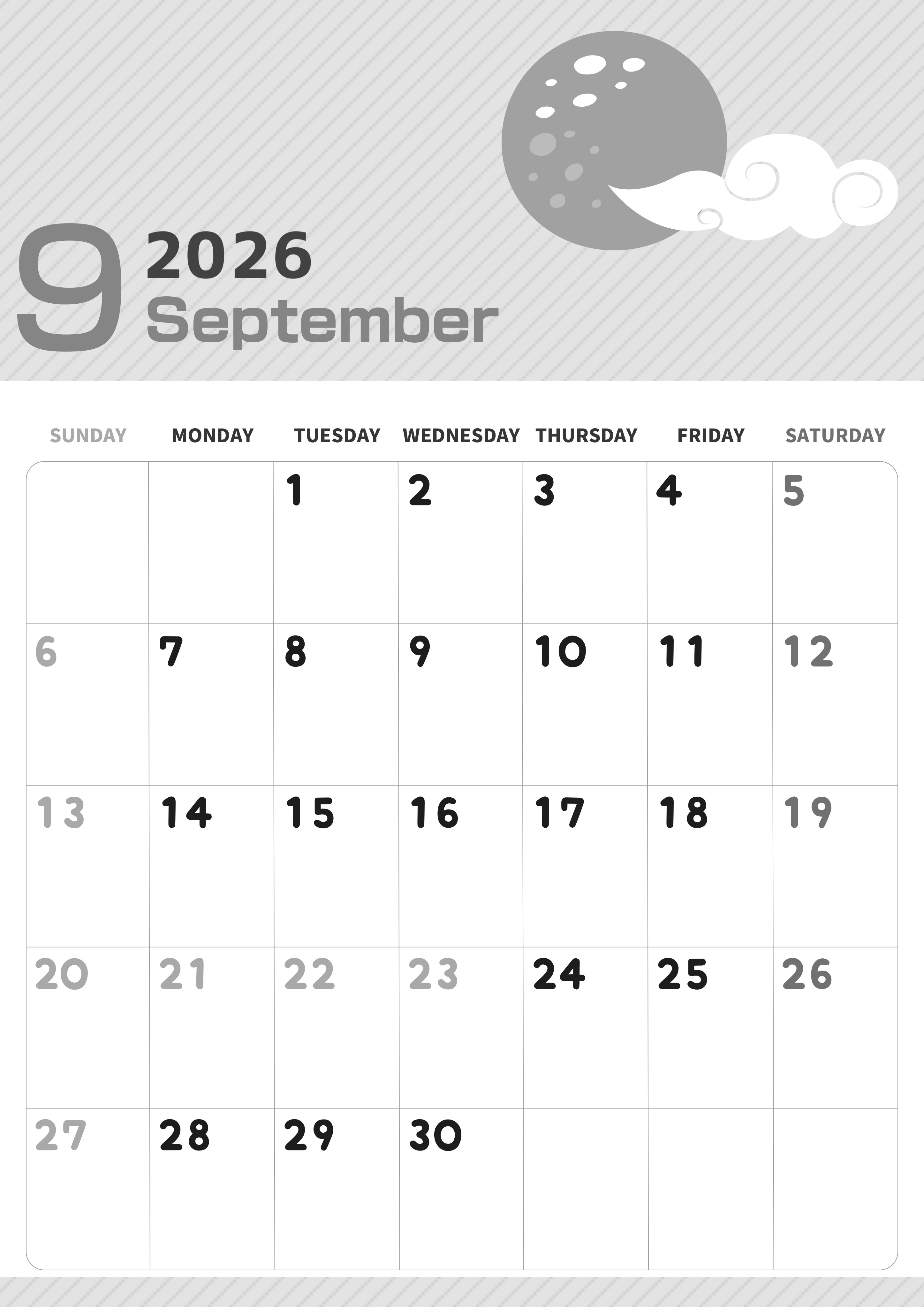 2026年9月縦型モノクロの日曜始まりの無料テンプレート白黒カレンダーです。雲と満月の組み合わせが粋なイラストです。かわいいだけでなく曜日によって文字を色分けしているので計画を見やすいレイアウトに仕上がっています。(2026-00350910)