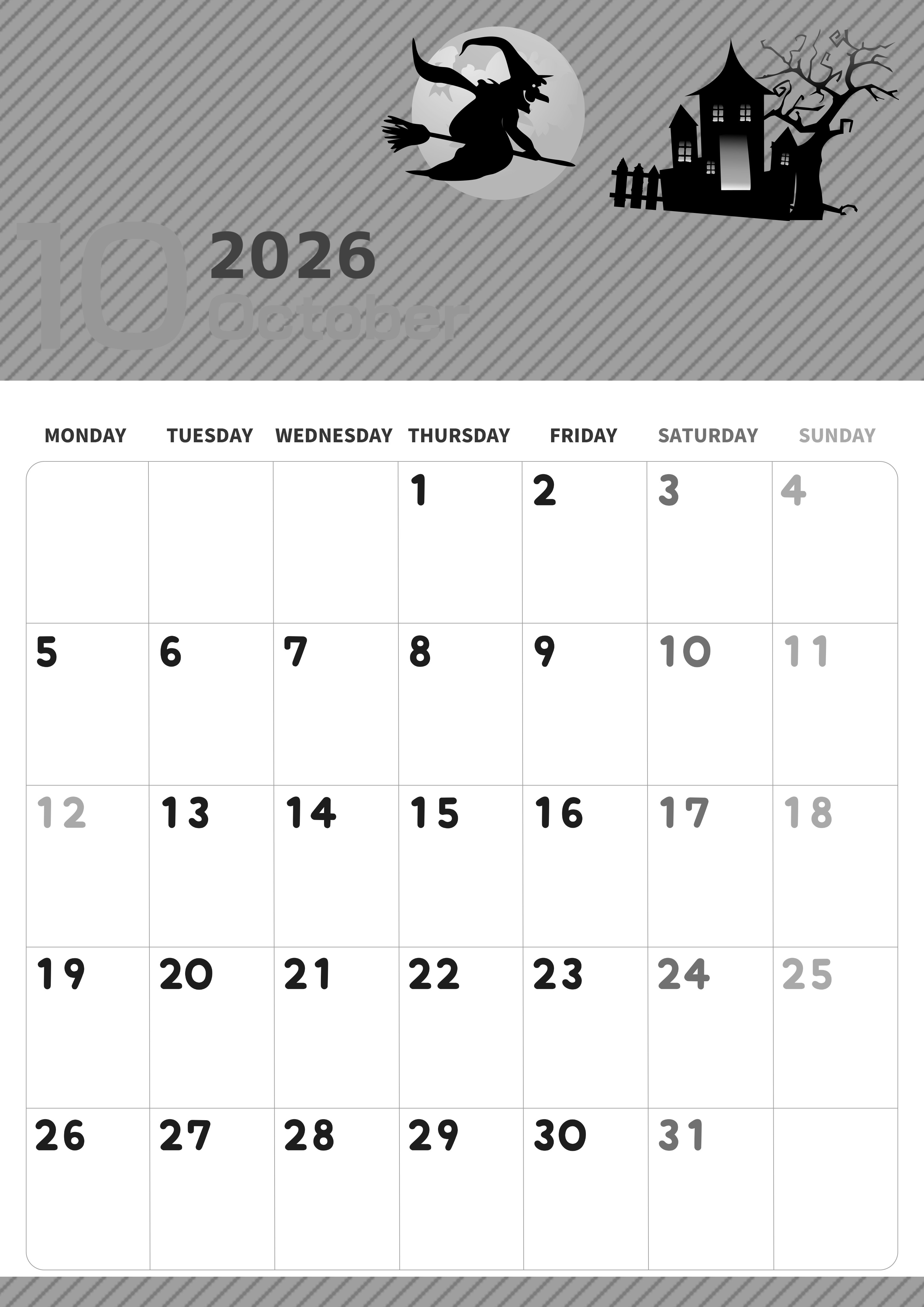 2026年10月縦型モノクロの月曜始まりの無料テンプレート白黒カレンダーです。お屋敷シルエットが目立つイベントテーマのイラストが特徴です。月曜始まりで数字の形もグミみたいでかわいい要素がたっぷりです。(2026-00351011)