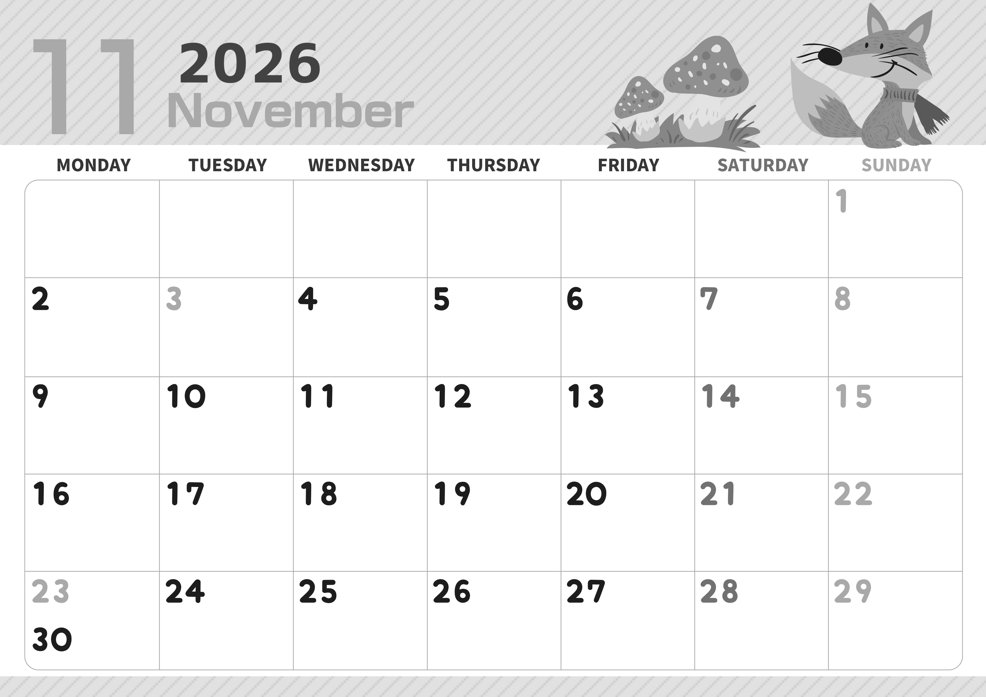2026年11月横型モノクロの月曜始まりの無料テンプレート白黒カレンダーです。森からひょっこり出てきたかわいい小動物が楽しそうに時間を過ごしている様子を描いたイラストです。月曜始まりでプラン立てに向いています。(2026-00351101)
