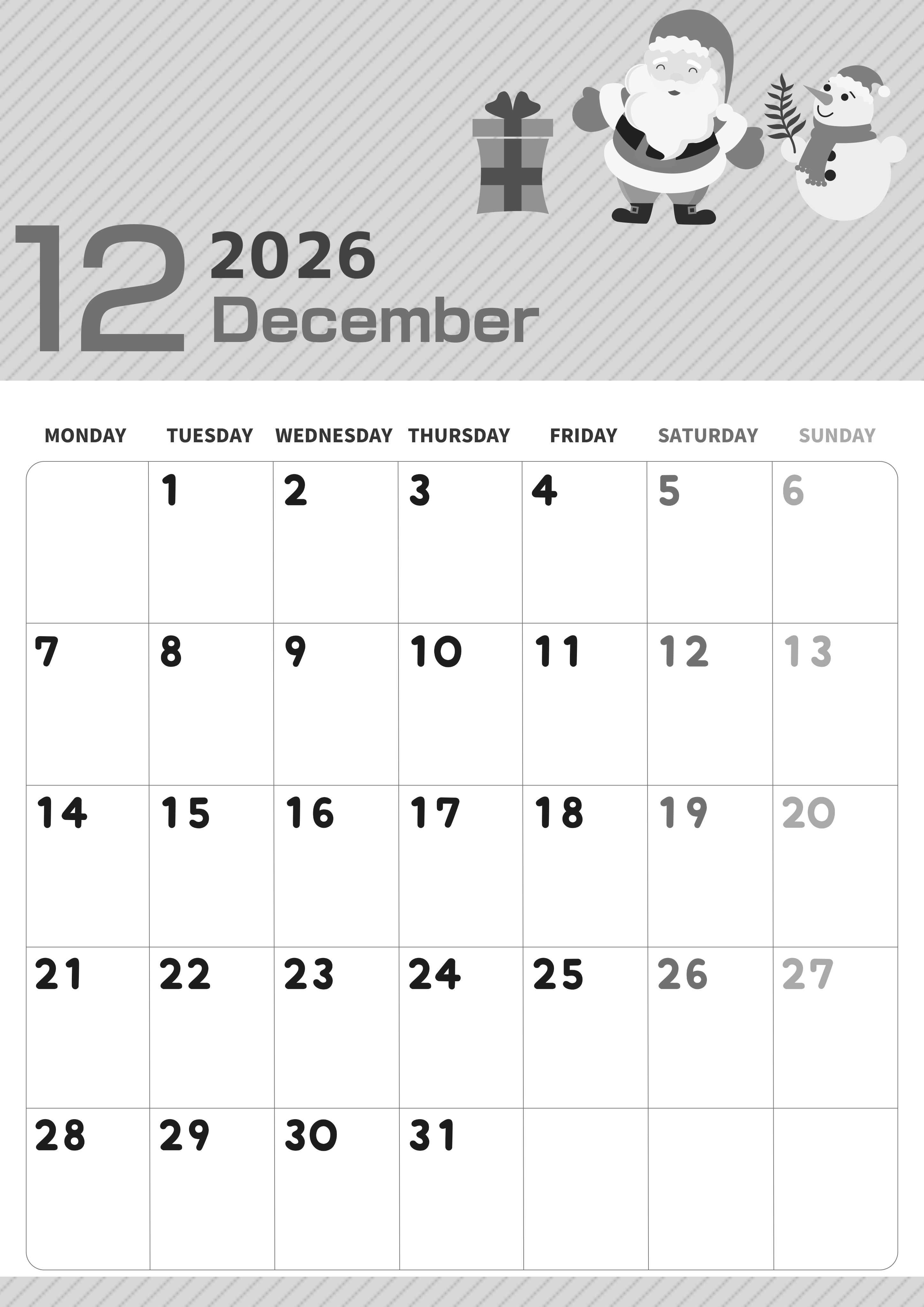 2026年12月縦型モノクロの月曜始まりの無料テンプレート白黒カレンダーです。行事が目白押しで忙しい年末ですがかわいいイラスト白黒カレンダーを使うことでポジティブに計画を立ててひとつひとつこなしていきましょう。(2026-00351211)