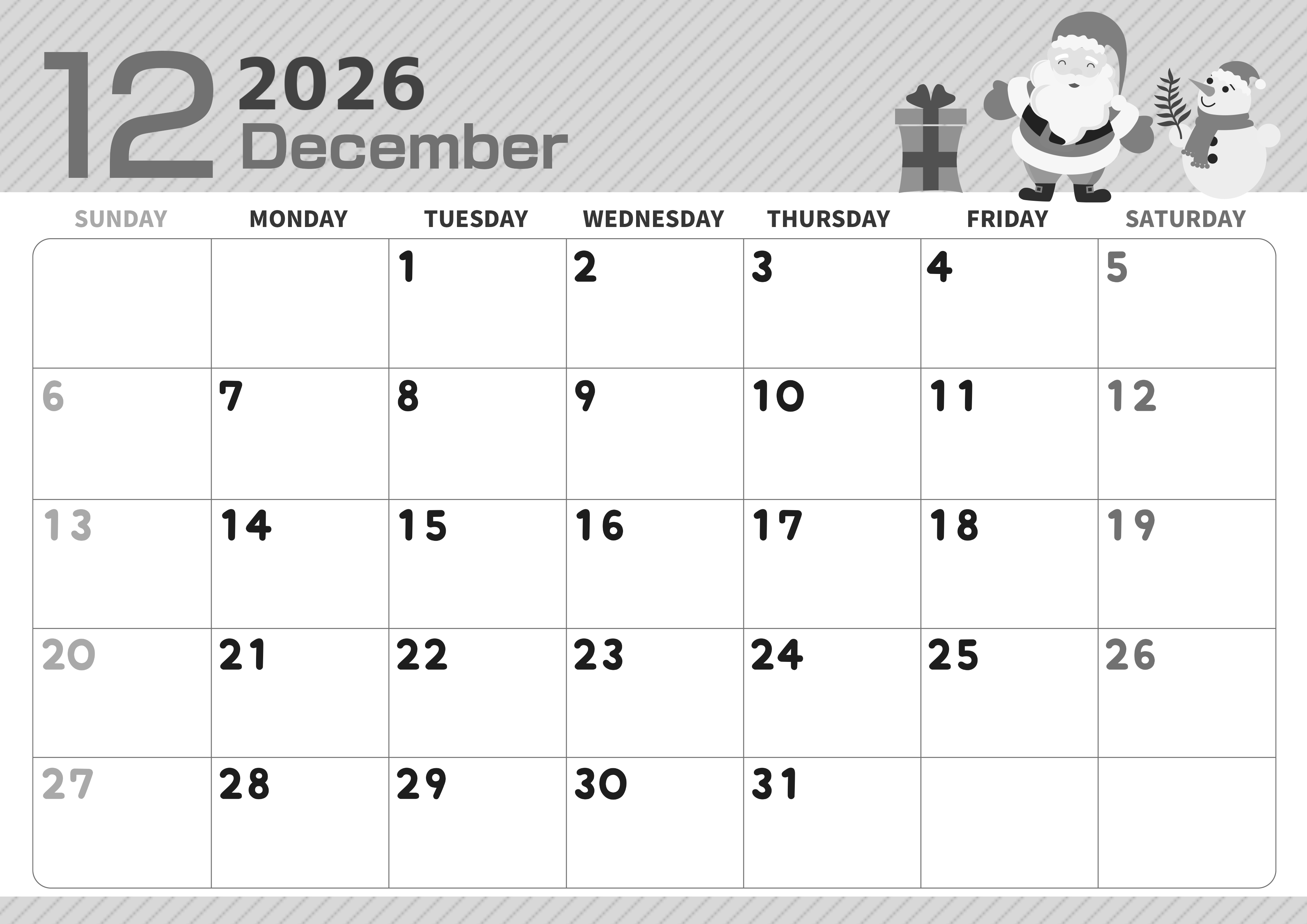2026年12月横型モノクロの日曜始まりの無料テンプレート白黒カレンダーです。淡い背景にサンタクロースが佇んでいる12月の行事をテーマにしたイラストがシンプルかつかわいいフリー素材に仕上がっています。(2026-00351200)