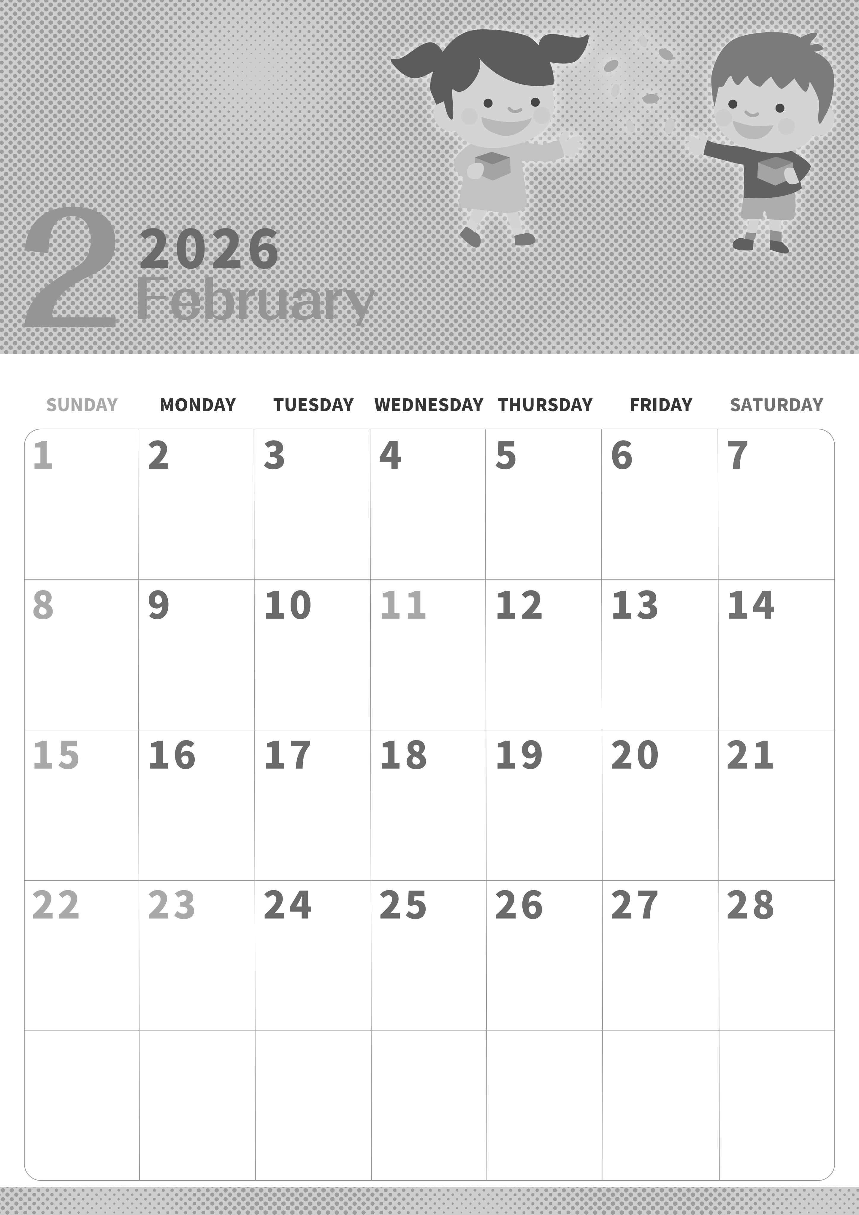 2026年2月縦型モノクロの日曜始まりの無料テンプレート白黒カレンダーです。男の子と女の子の子供のイラストがかわいい平和なデザインの白黒カレンダーです。スケジュールを書き込みできる利便性の高い白黒カレンダーをお求めの方にぴったりです。(2026-00360210)