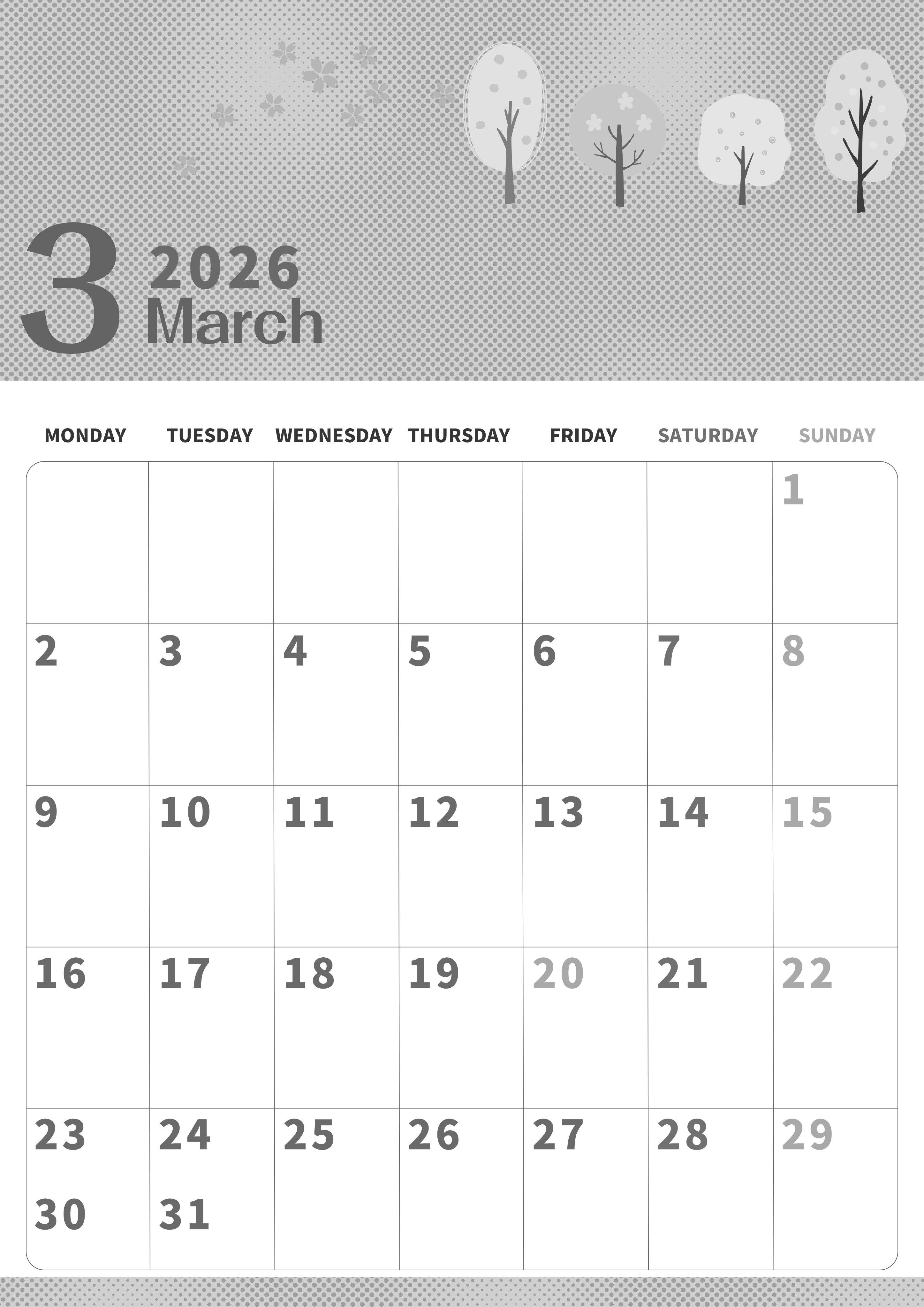 2026年3月縦型モノクロの月曜始まりの無料テンプレート白黒カレンダーです。桜の木が並んで仲良く立っているかわいいイラスト白黒カレンダーです。月曜始まりなので勉強や仕事のタスク管理を書き込みするのにぴったりです。(2026-00360311)