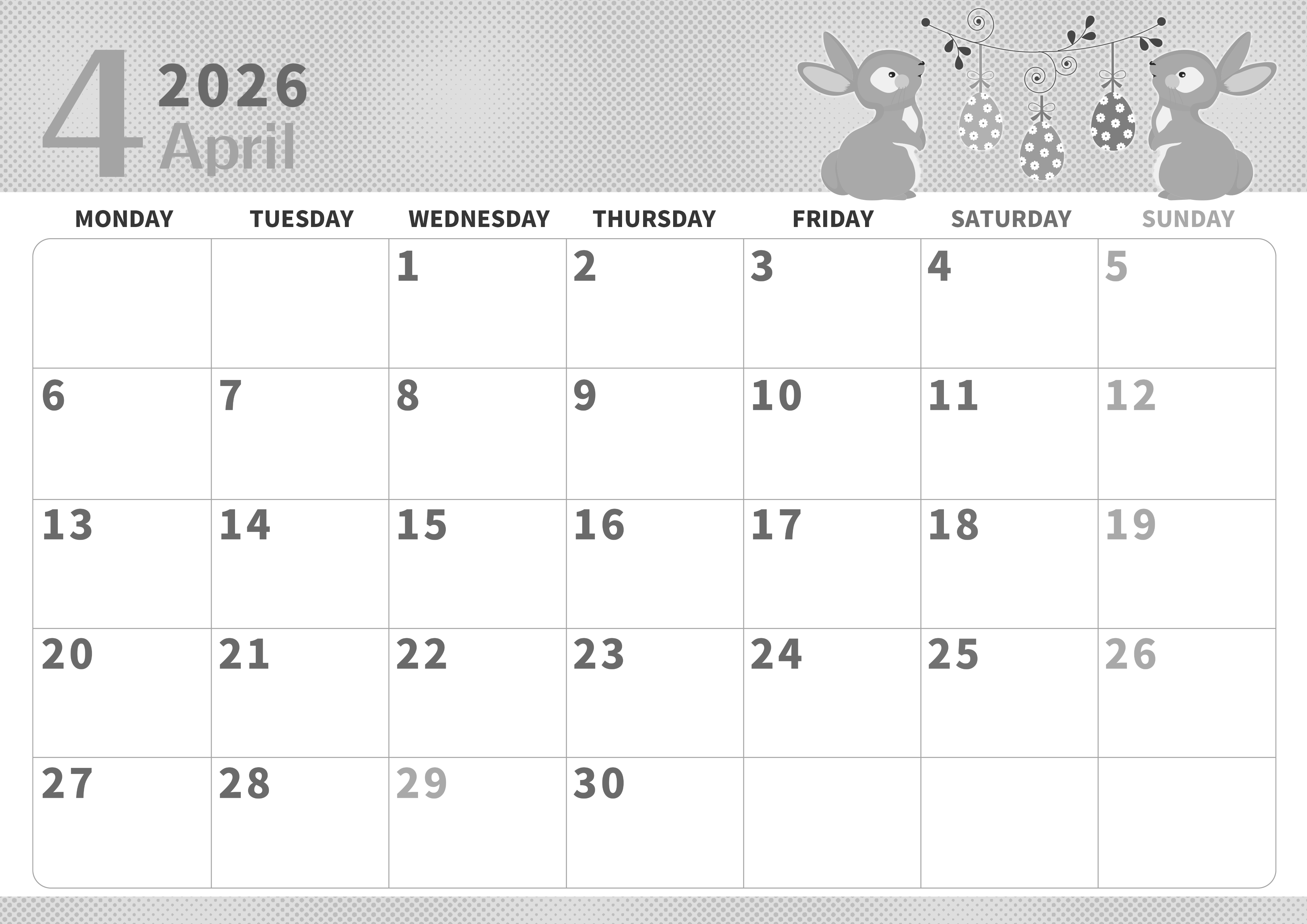 2026年4月横型モノクロの月曜始まりの無料テンプレート白黒カレンダーです。背景にふわふわとしたかわいいうさぎのカップルが添えられたかわいいイラスト白黒カレンダーは月曜始まりなので使い勝手も良いです。(2026-00360401)