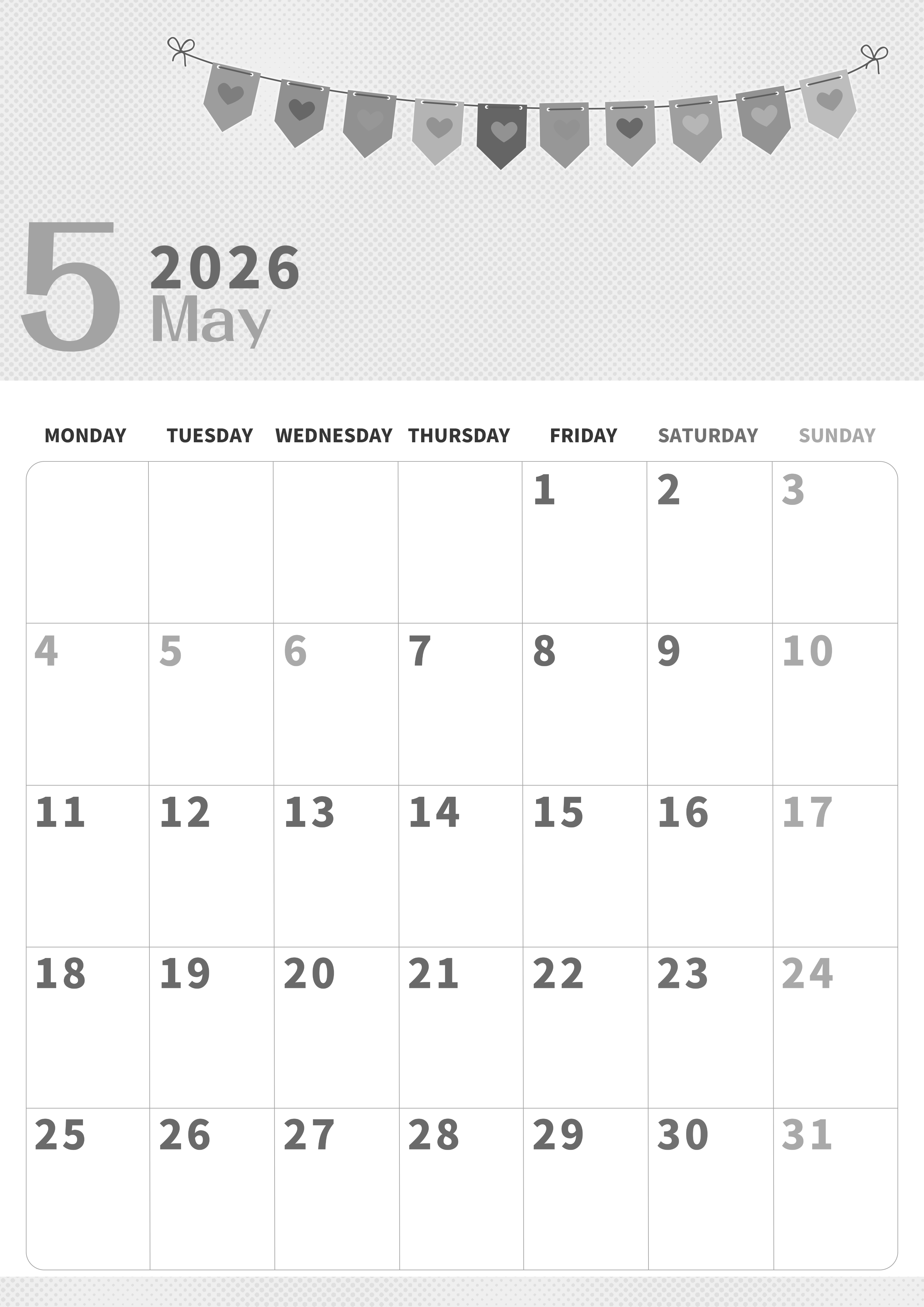 2026年・無料のカレンダーテンプレート 2026年5月縦型モノクロの月曜始まり 旗のイラストのかわいいA4無料白黒カレンダー(2026-00360511) 素材状デザイン王 2025年4月1日 2026年5月縦型モノクロの月曜始まりの無料テンプレート白黒カレンダーです。ハートマークがかわいい旗がたくさん描かれているイラストがチャームポイントの無料で便利な白黒カレンダーは月曜始まりです。(2026-00360511) 5月 縦型のカレンダー 月曜始まり 白黒 カレンダーデザイン-0036