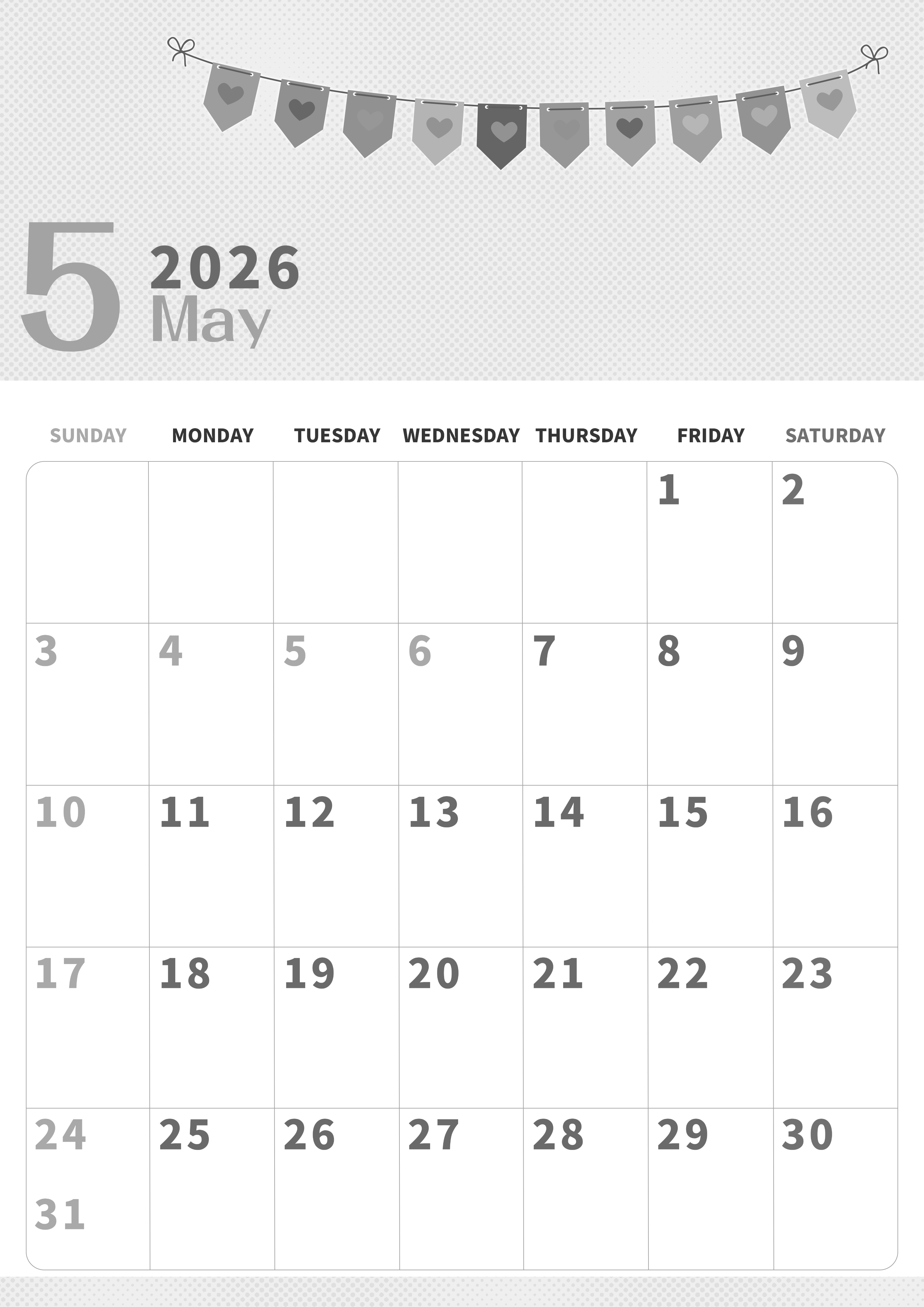 2026年5月縦型モノクロの日曜始まりの無料テンプレート白黒カレンダーです。お祭りで使われるような旗が掲げられていてモチベーションが上がるような元気づけてくれるかわいいイラストがついている白黒カレンダーとなっています。(2026-00360510)