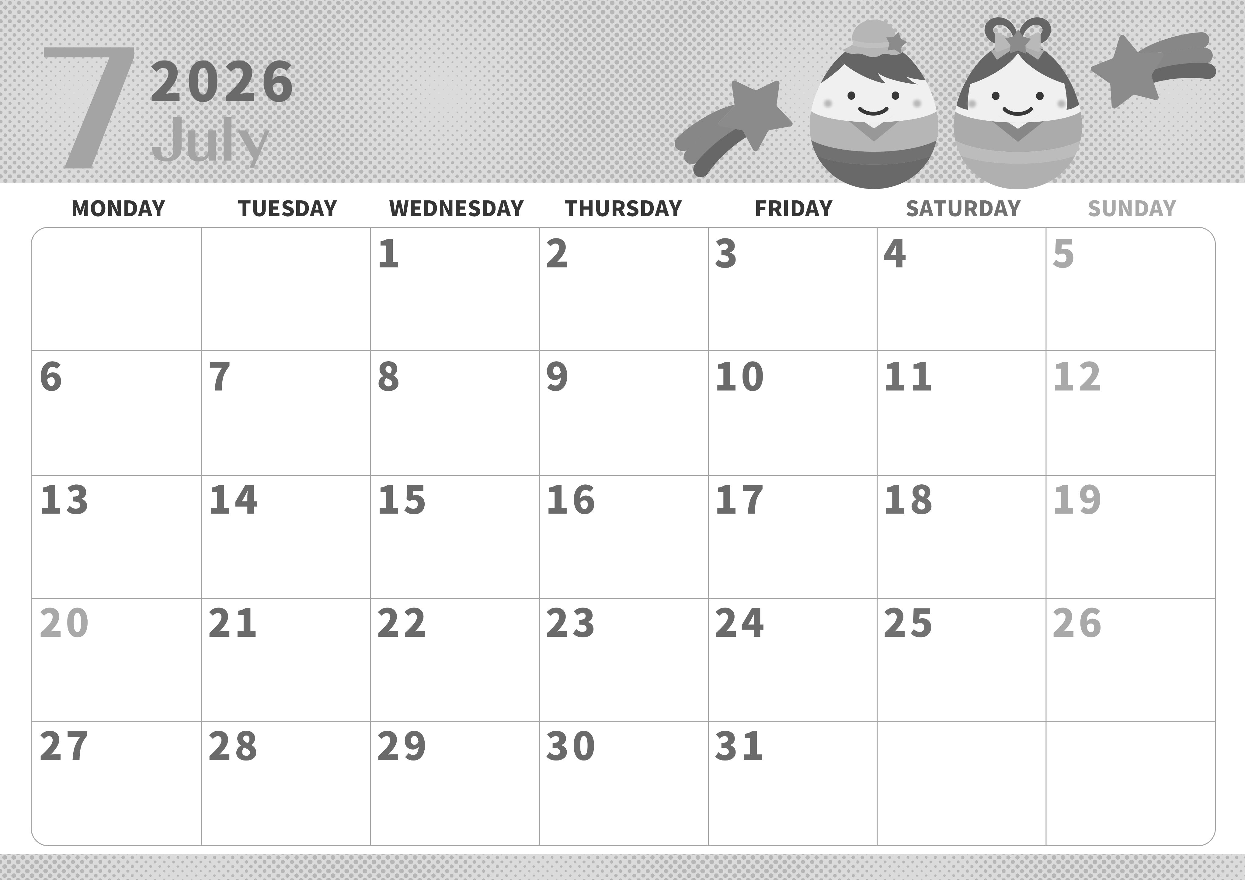 2026年7月横型モノクロの月曜始まりの無料テンプレート白黒カレンダーです。季節の行事をテーマにした白黒カレンダーは月曜始まりなのでタスク管理に向いています。コロコロとした織姫と彦星がポップでかわいい細部までしっかりと描かれたイラストです。(2026-00360701)