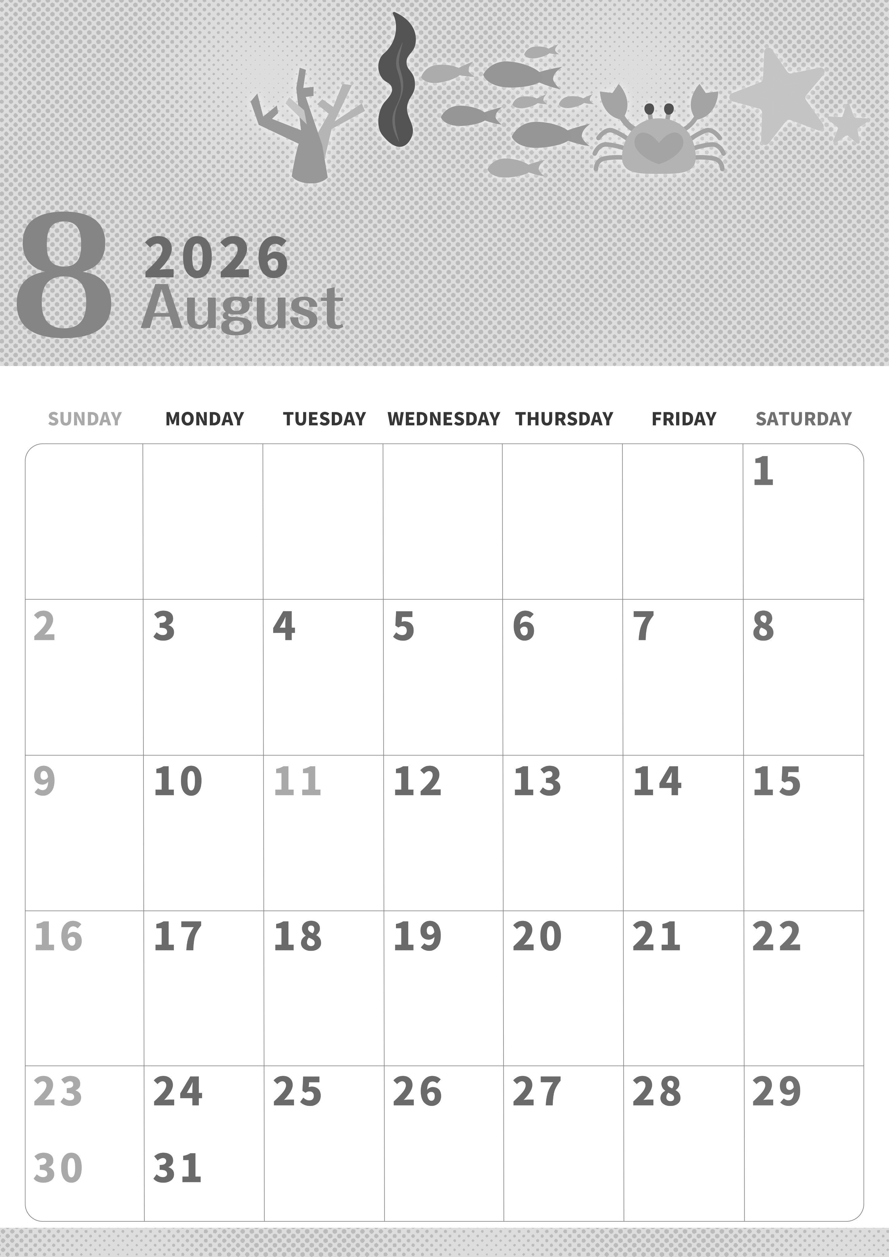 2026年8月縦型モノクロの日曜始まりの無料テンプレート白黒カレンダーです。水族館に居るような気持ちにさせてくれるかわいいイラストの無料白黒カレンダーです。文字が書き込みしやすいフォーマットです。(2026-00360810)
