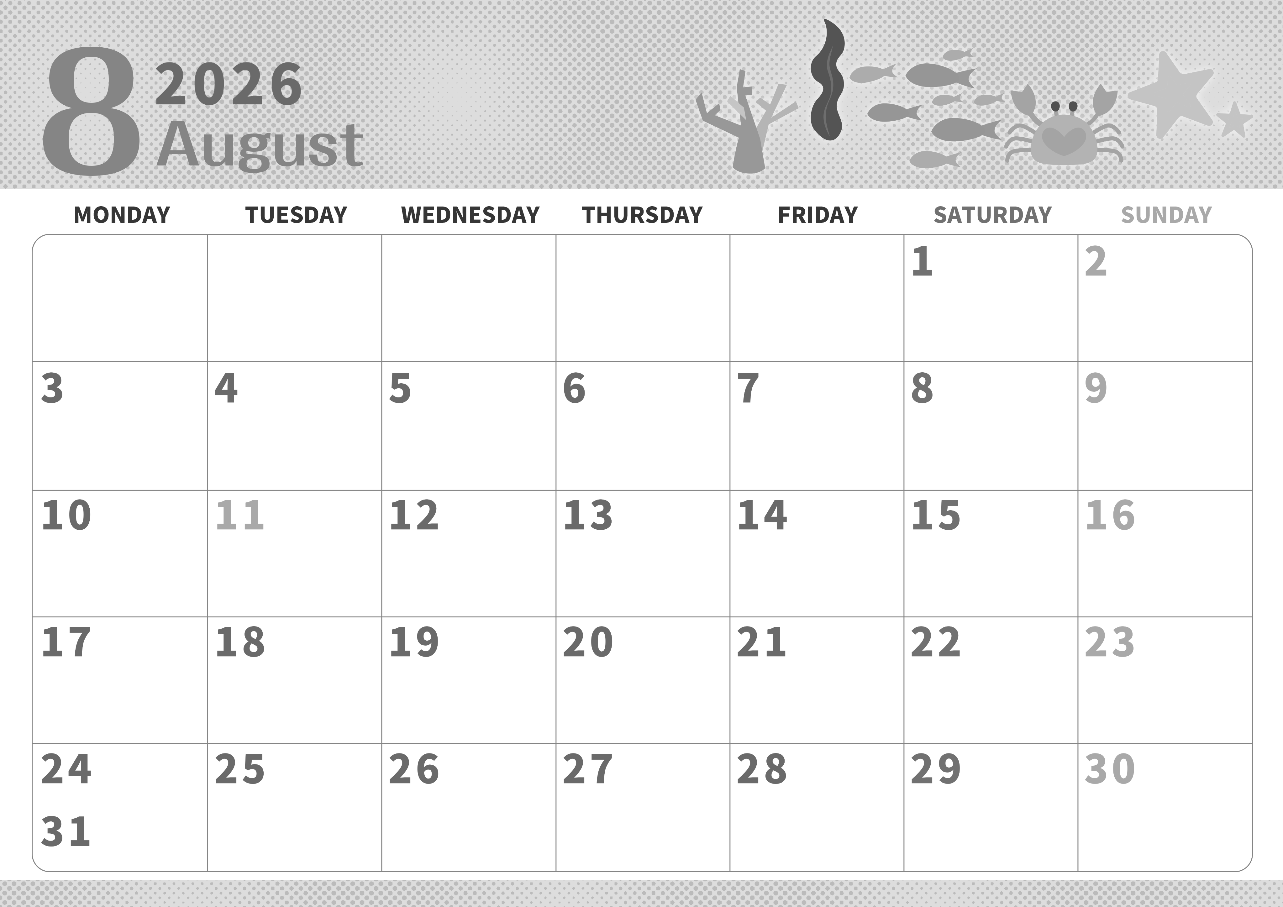2026年8月横型モノクロの月曜始まりの無料テンプレート白黒カレンダーです。水族館をモチーフにしているイラストが描かれているかわいい白黒カレンダー素材です。月曜始まりで家族やカップルの予定を立てるのに向いています。(2026-00360801)