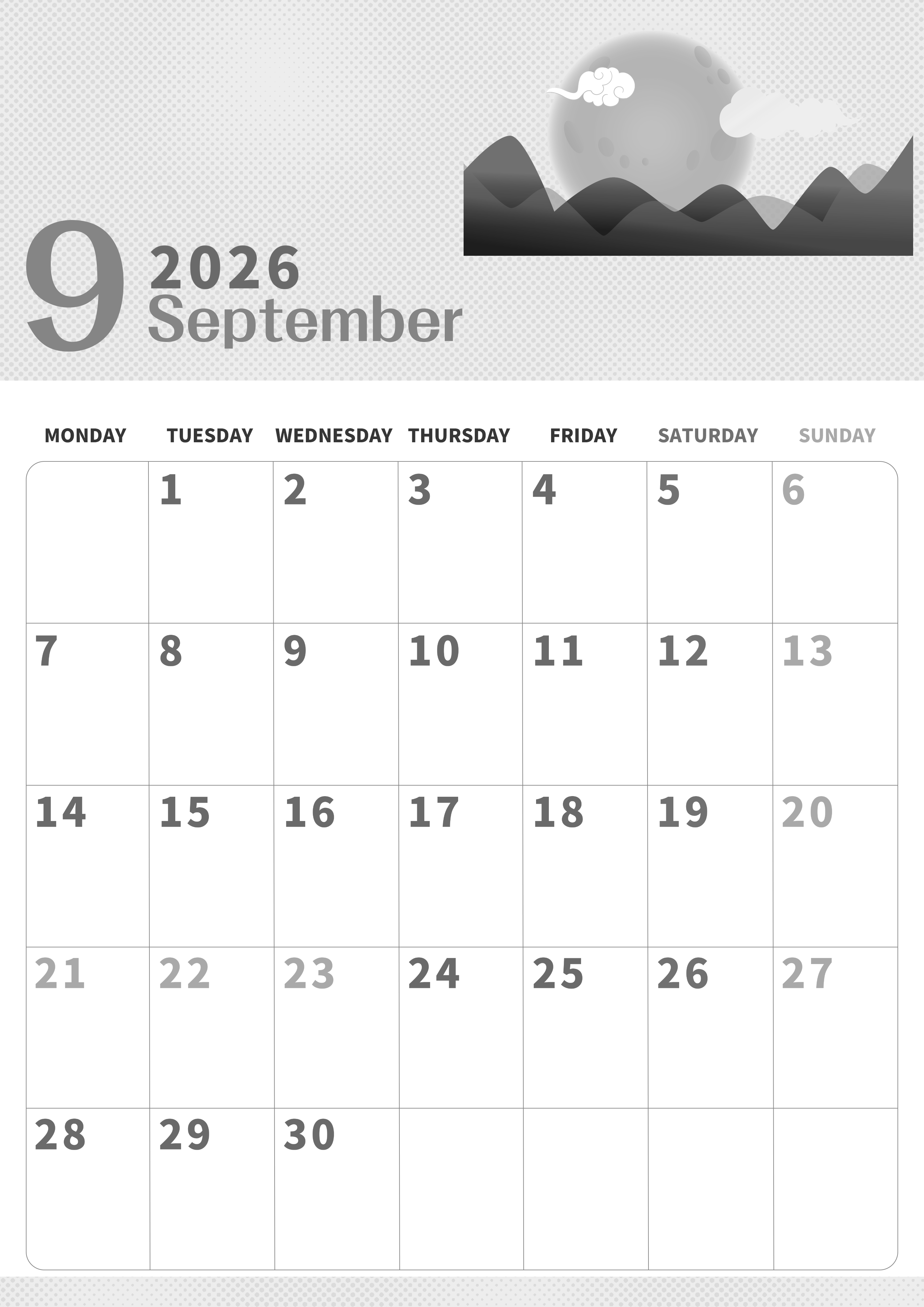2026年9月縦型モノクロの月曜始まりの無料テンプレート白黒カレンダーです。季節感のあるイラストが特徴のかわいい白黒カレンダーです。月曜始まりなので家族や子供や夫婦のスケジュールを整理整頓するのに適しています。(2026-00360911)