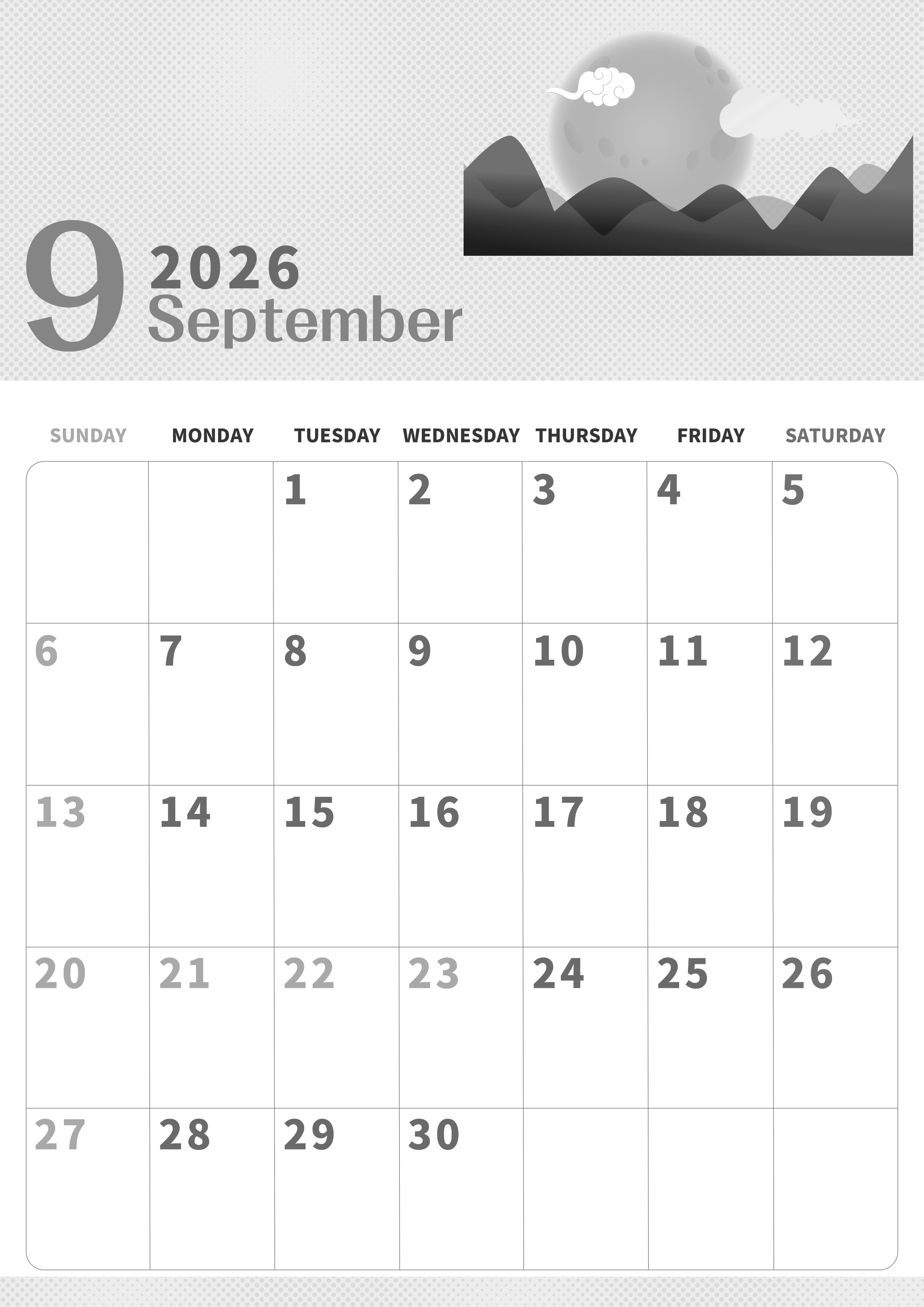 2026年9月縦型モノクロの日曜始まりの無料テンプレート白黒カレンダーです。季節を感じさせる厳かな満月のイラストに少し秋の切なさも感じさせるようなそれでいてかわいいテイストもしっかり盛り込まれている白黒カレンダーです。(2026-00360910)