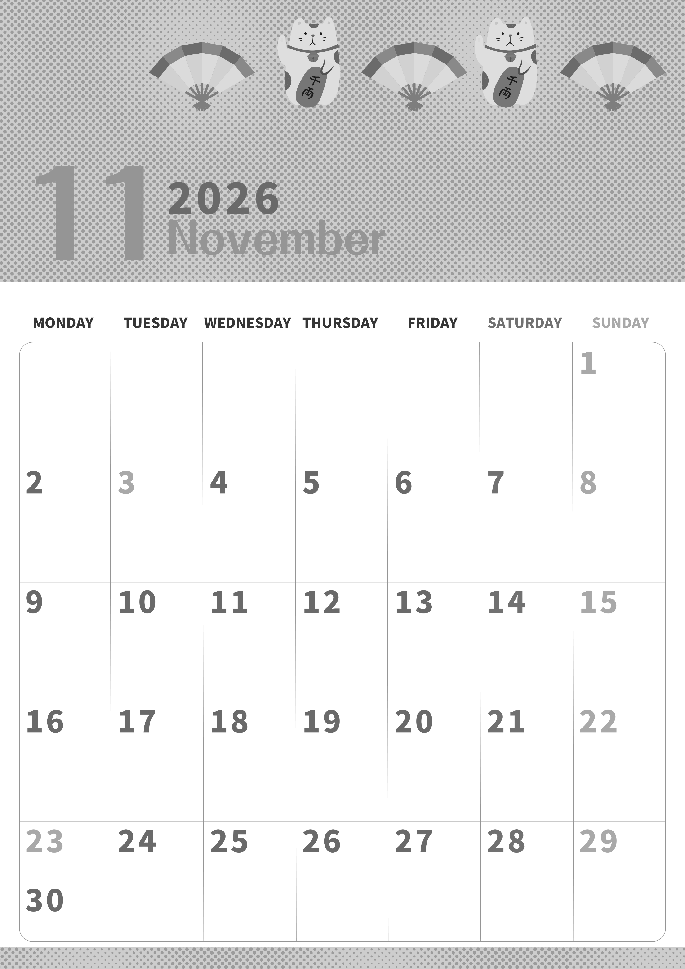 2026年11月縦型モノクロの月曜始まりの無料テンプレート白黒カレンダーです。縁起の良い招き猫のイラストがとてもかわいいです。運気を取り戻したい、もっと上げたいという人に特におすすめしたいです。(2026-00361111)