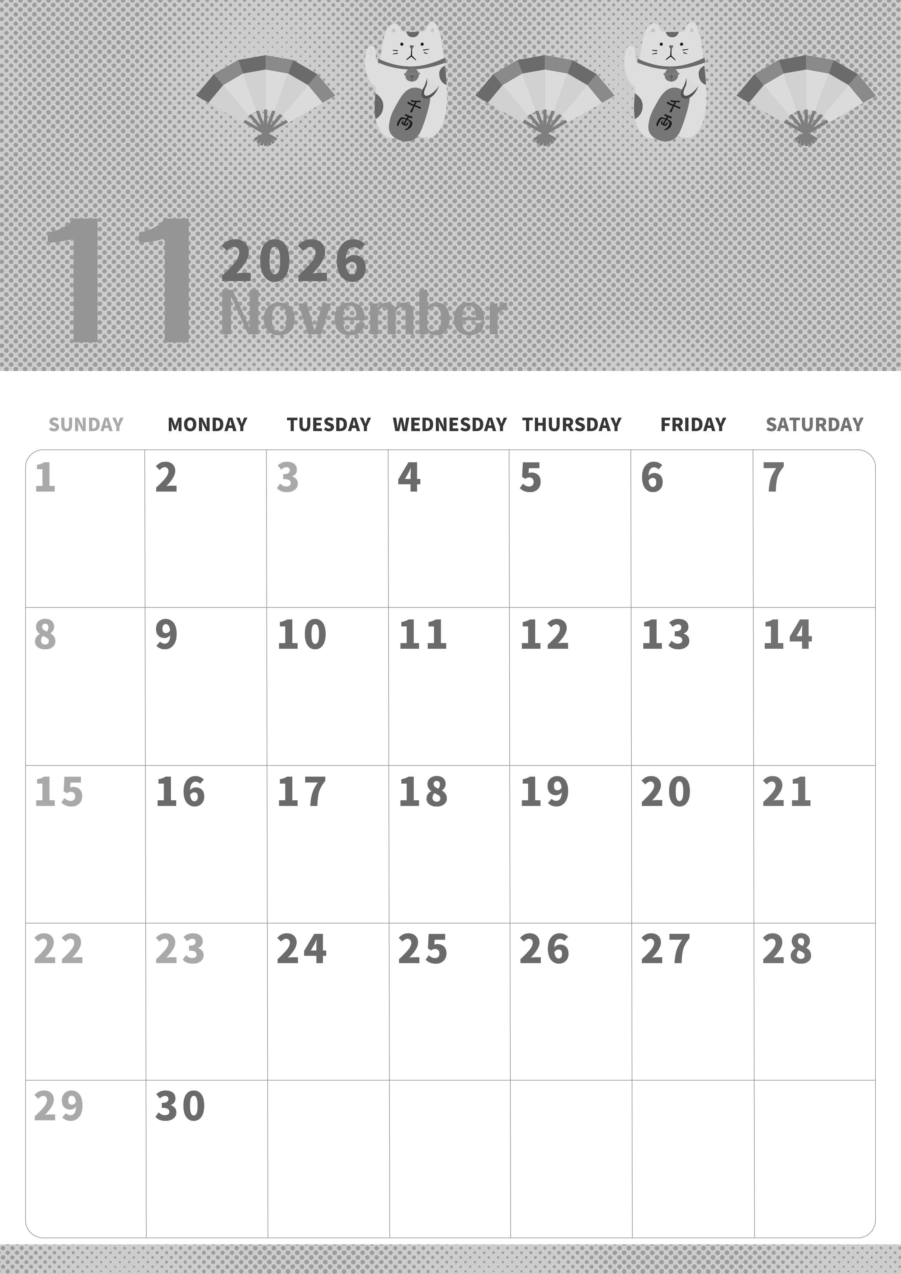 2026年11月縦型モノクロの日曜始まりの無料テンプレート白黒カレンダーです。小判を抱えた招き猫を丁寧に描いています。かわいい雰囲気のイラスト白黒カレンダーをお探しの人に無料ダウンロードをおすすめします。(2026-00361110)