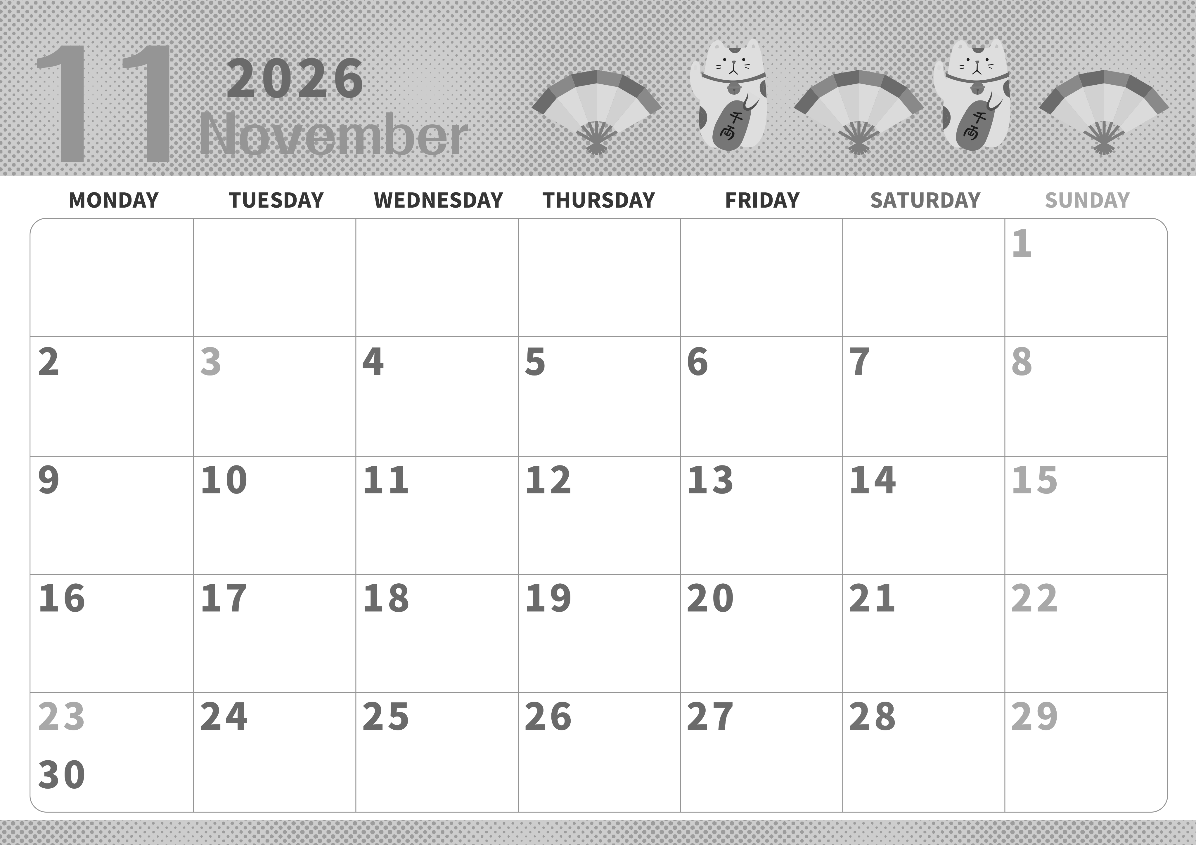 2026年11月横型モノクロの月曜始まりの無料テンプレート白黒カレンダーです。小判を抱えた招き猫がかわいいイラスト白黒カレンダーです。月曜始まりで仕事や勉強のタスク管理におすすめできるフリー素材です。(2026-00361101)
