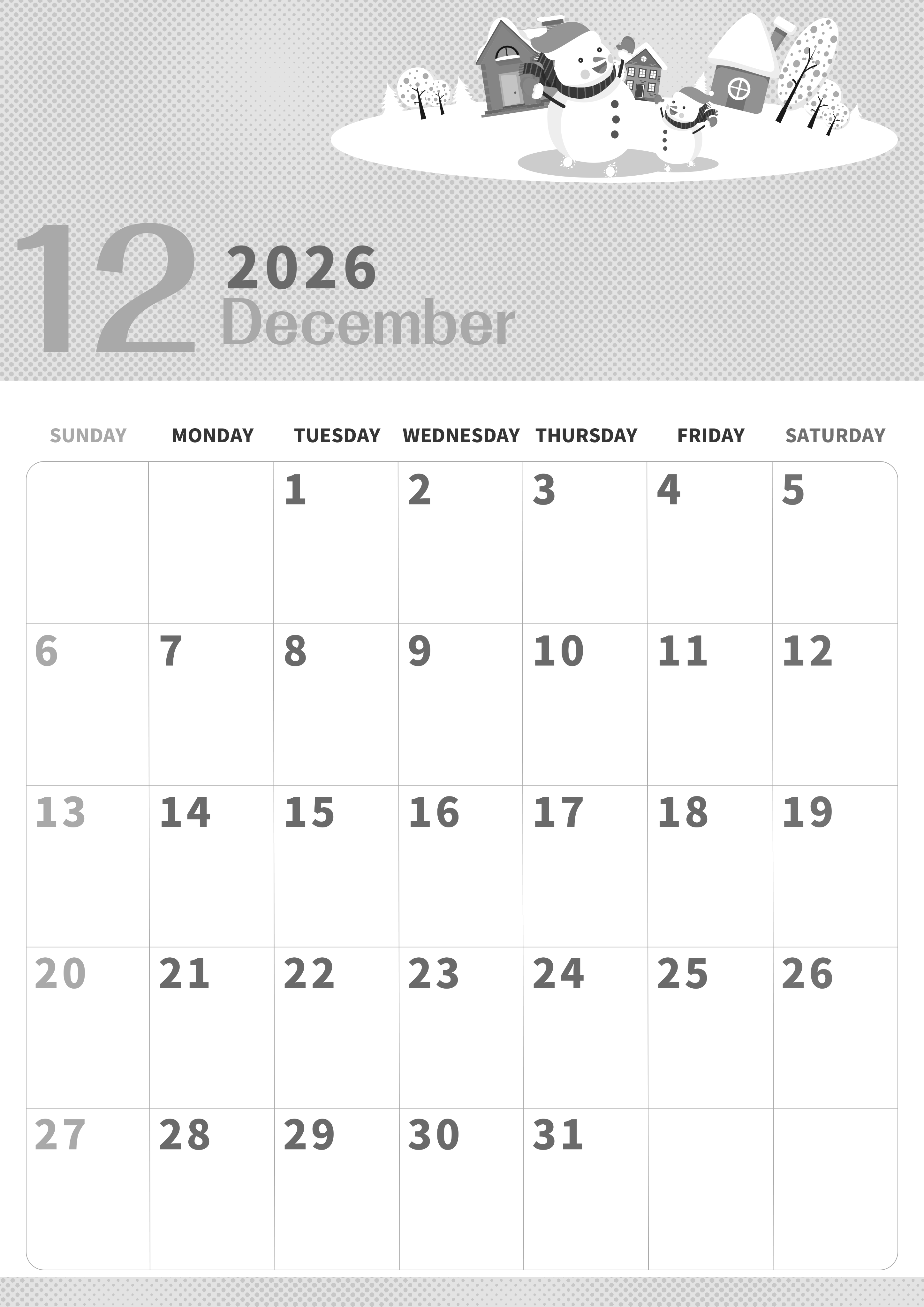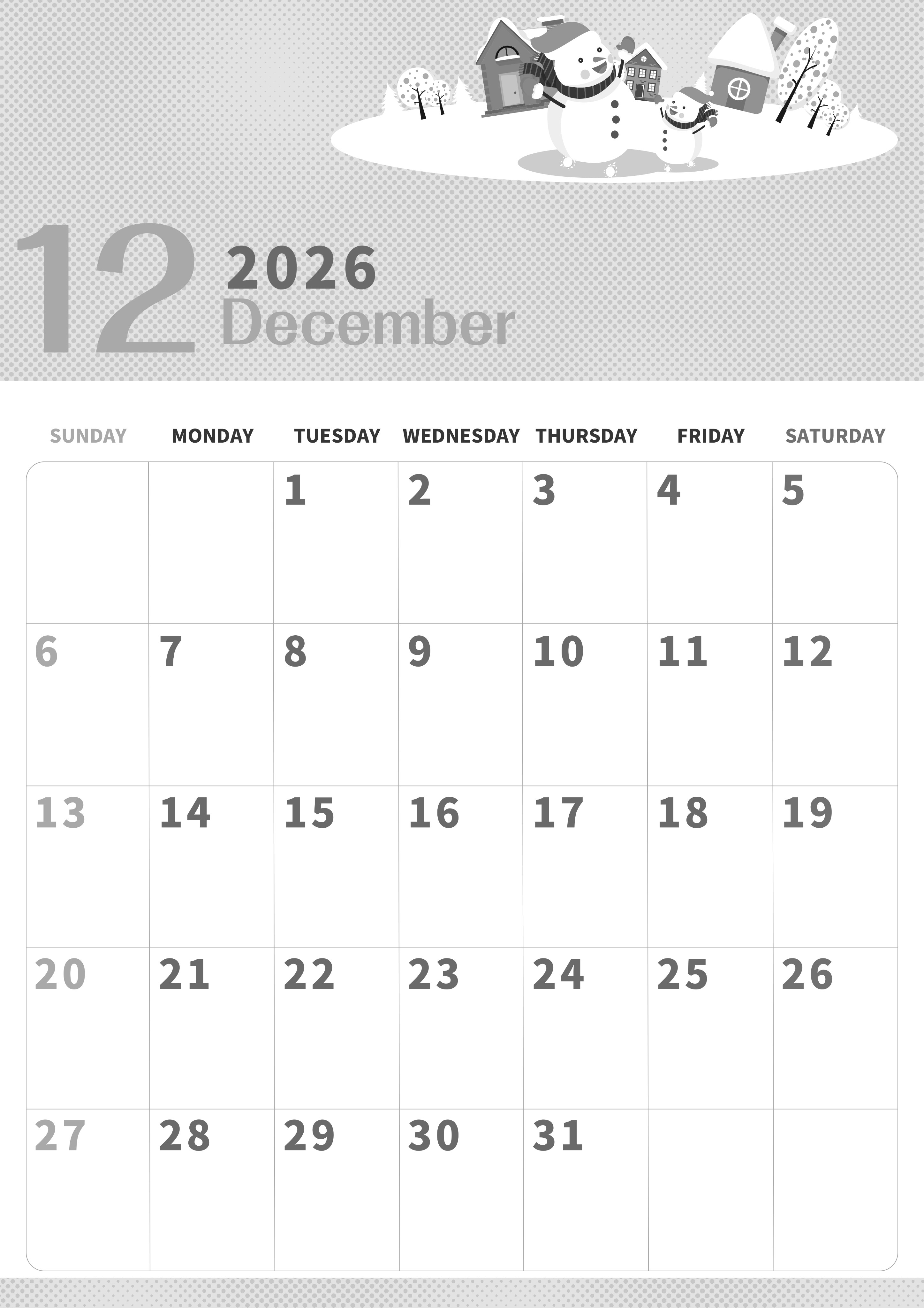 2026年12月縦型モノクロの日曜始まりの無料テンプレート白黒カレンダーです。ニコニコと笑顔で元気なかわいい雪だるまたちが雪景色に溶け込んでいる様子をイラストにしました。曜日ごとに文字の色分けもされています。(2026-00361210)