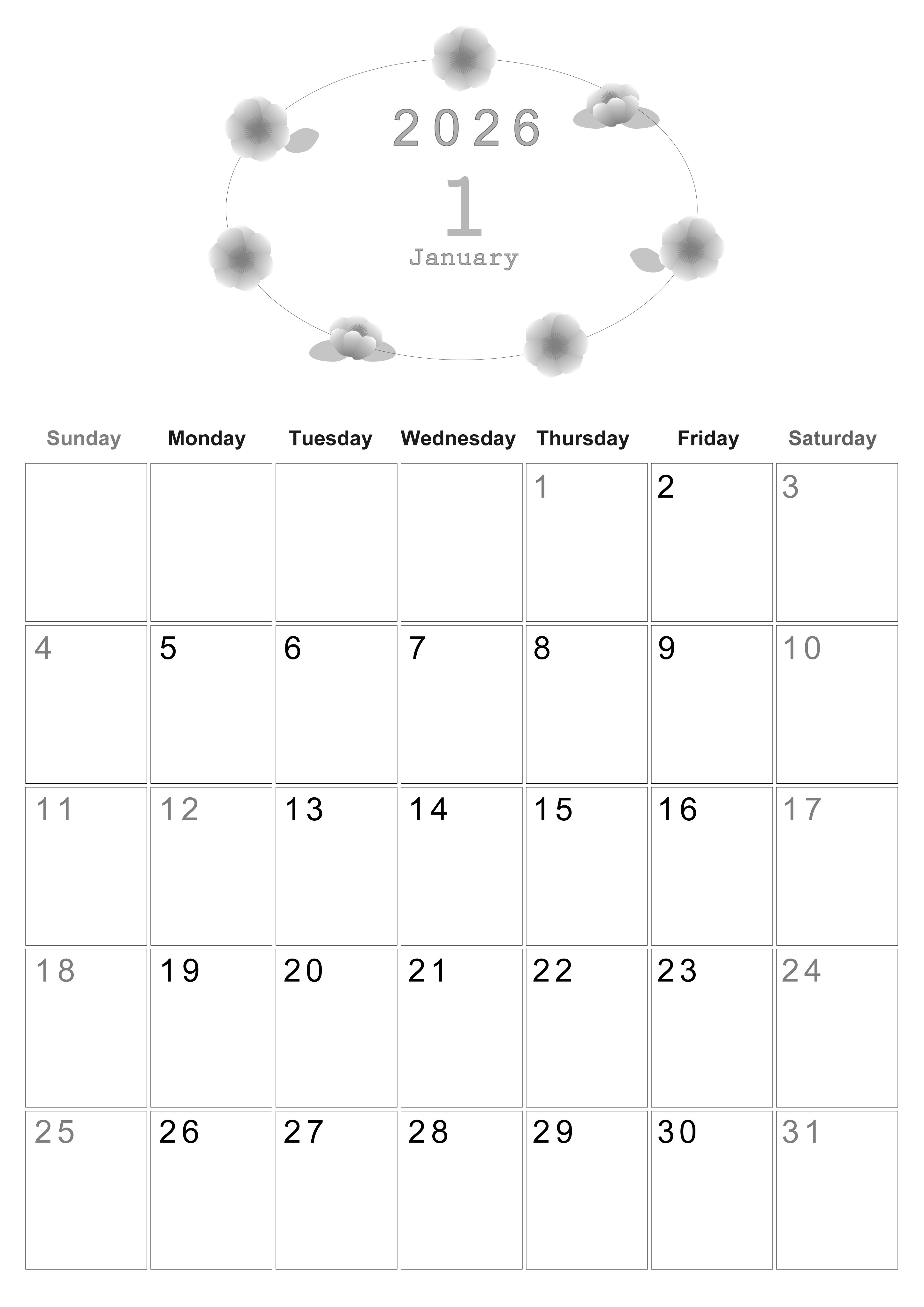 2026年1月縦型モノクロの日曜始まり白黒カレンダーです。和風でかわいいイラストが上部にあしらわれていますが、スケジュールを記入する欄は大きめの余白を設けているので見やすいフォーマットとなっています。ダウンロードは無料で実施可能な白黒カレンダーです。(2026-00370110)