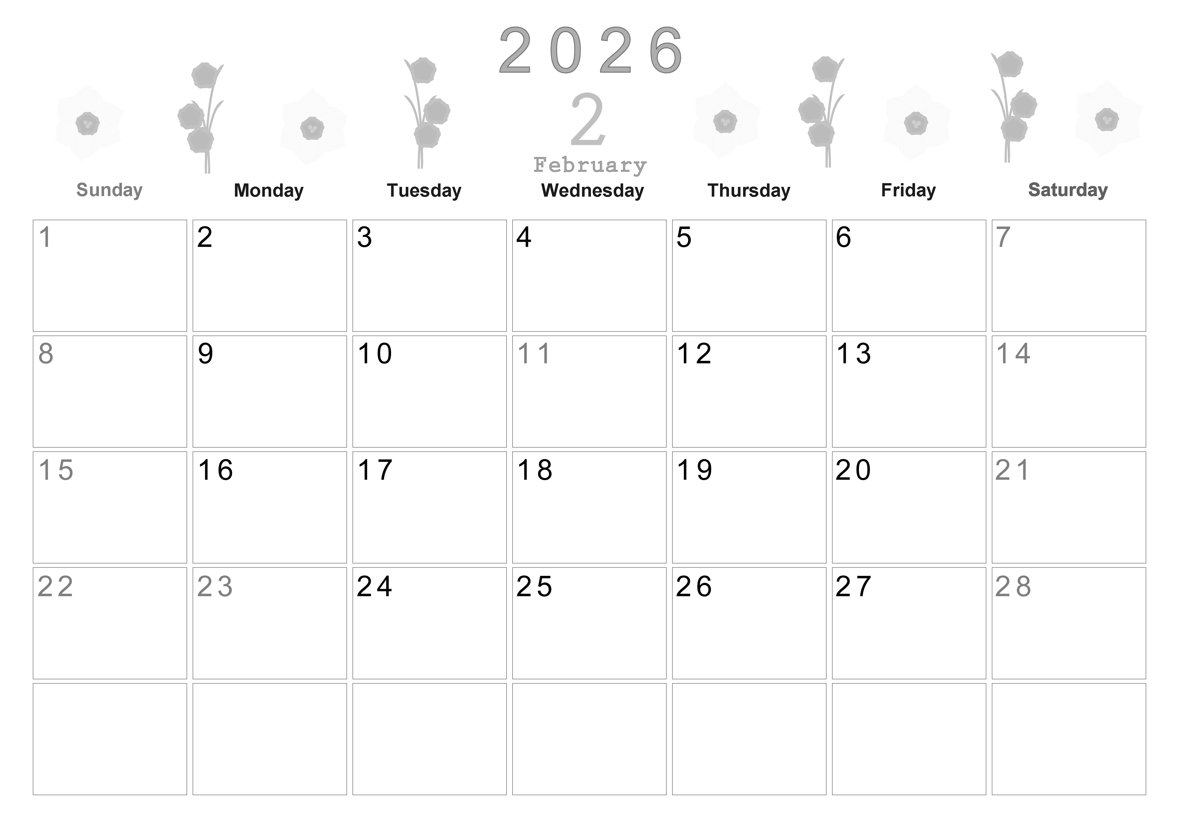 2026年・無料のカレンダーテンプレート 2026年2月横型モノクロの日曜始まり 草花がかわいいイラストA4無料白黒カレンダー(2026-00370200) 素材状デザイン王 2025年4月1日 2026年2月横型モノクロの日曜始まりの無料テンプレート白黒カレンダーです。上品な花がかわいいイラストの季節感溢れる白黒カレンダーのテンプレートです。草花が好きな人におすすめのフリー素材です。(2026-00370200) 2月 横型のカレンダー 日曜始まり 白黒 カレンダーデザイン-0037