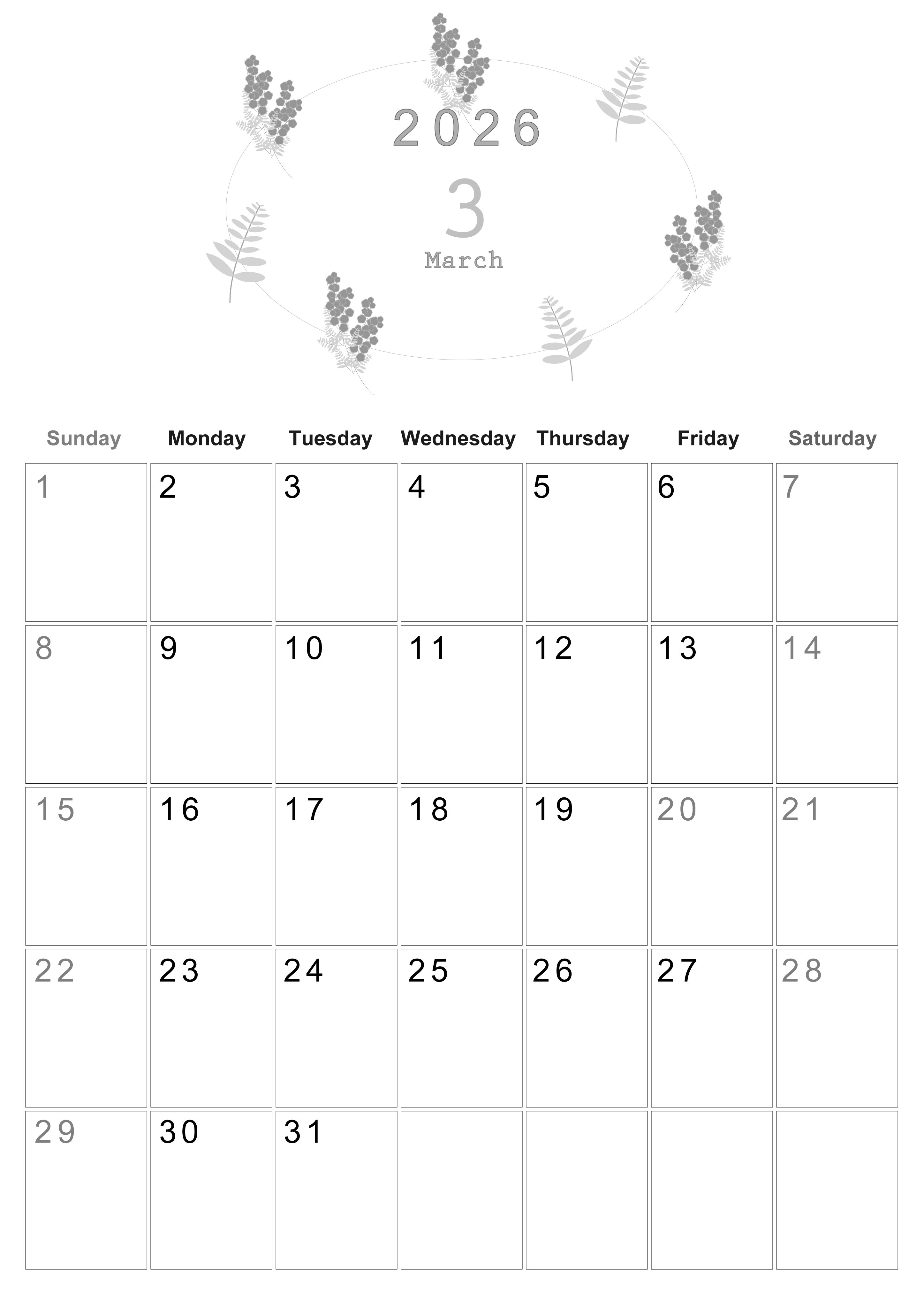 2026年3月縦型モノクロの日曜始まりの無料テンプレート白黒カレンダーです。イエローのフラワーがちりばめられているかわいいイラストがほどこされた罫線がくっきりしている使い勝手の良い白黒カレンダー無料テンプレートです。(2026-00370310)