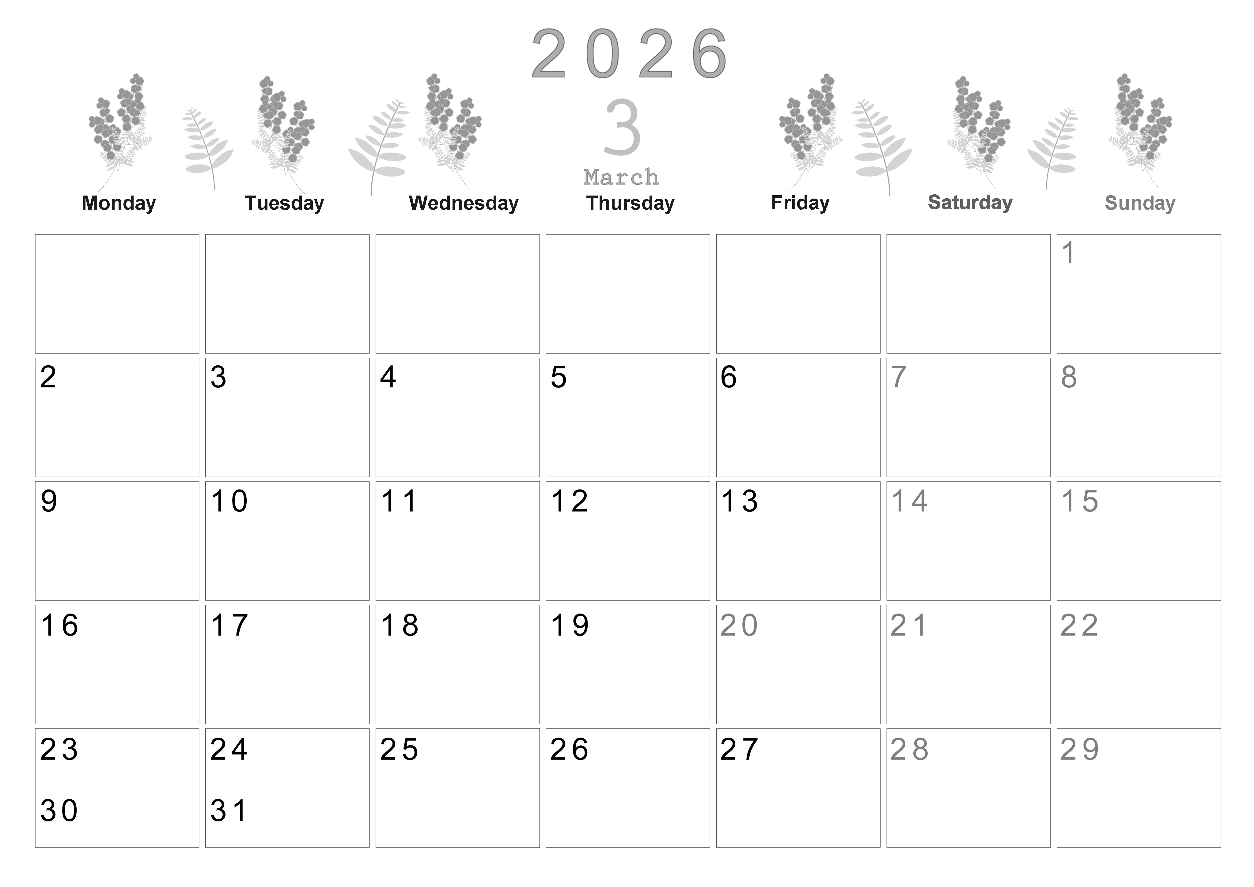 2026年3月横型モノクロの月曜始まりの無料テンプレート白黒カレンダーです。レイアウトが一枠一枠大きめなので使いやすい白黒カレンダーです。ダウンロードは無料でありながらフラワーのイラストがおしゃれかわいいコンテンツです。(2026-00370301)