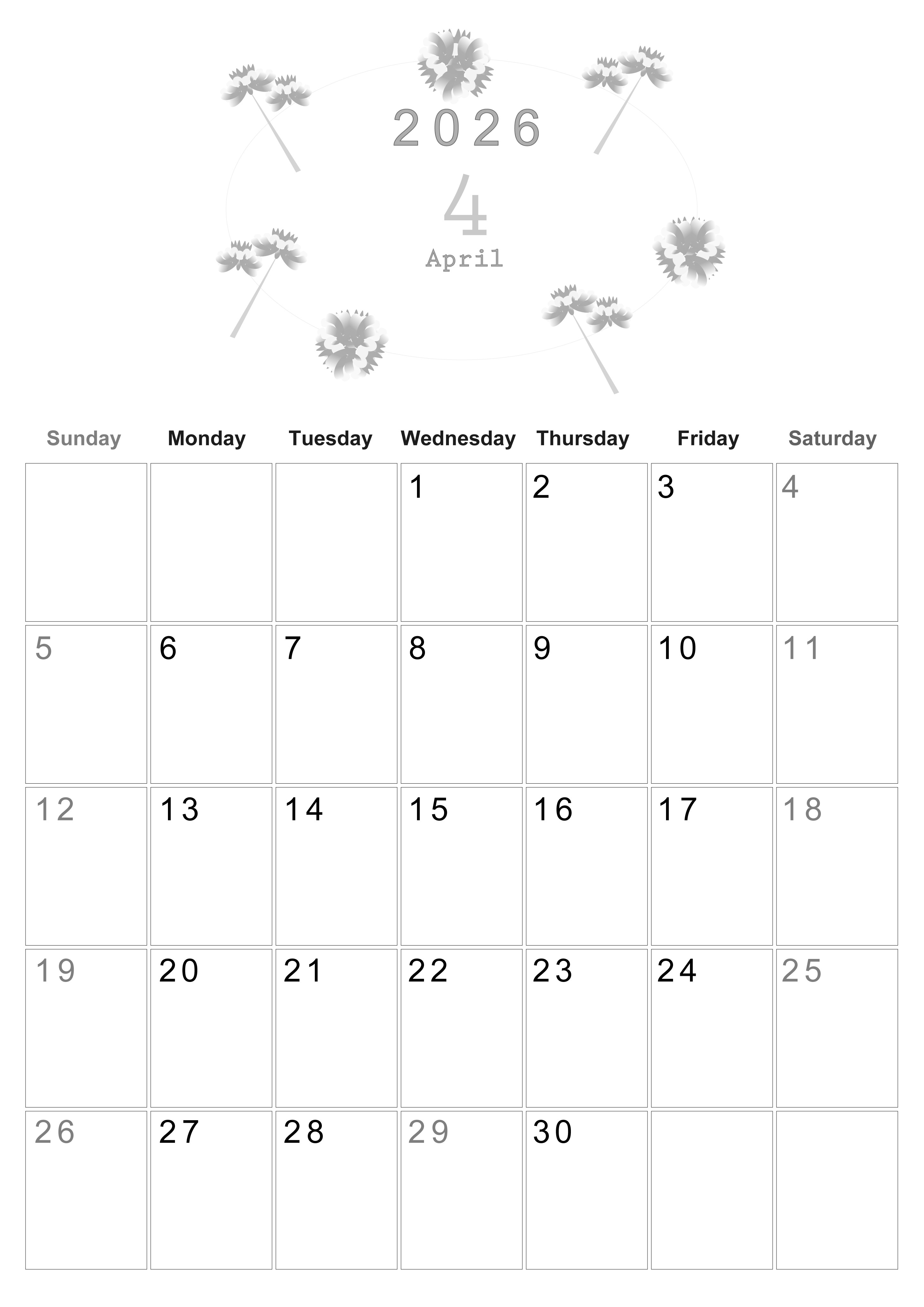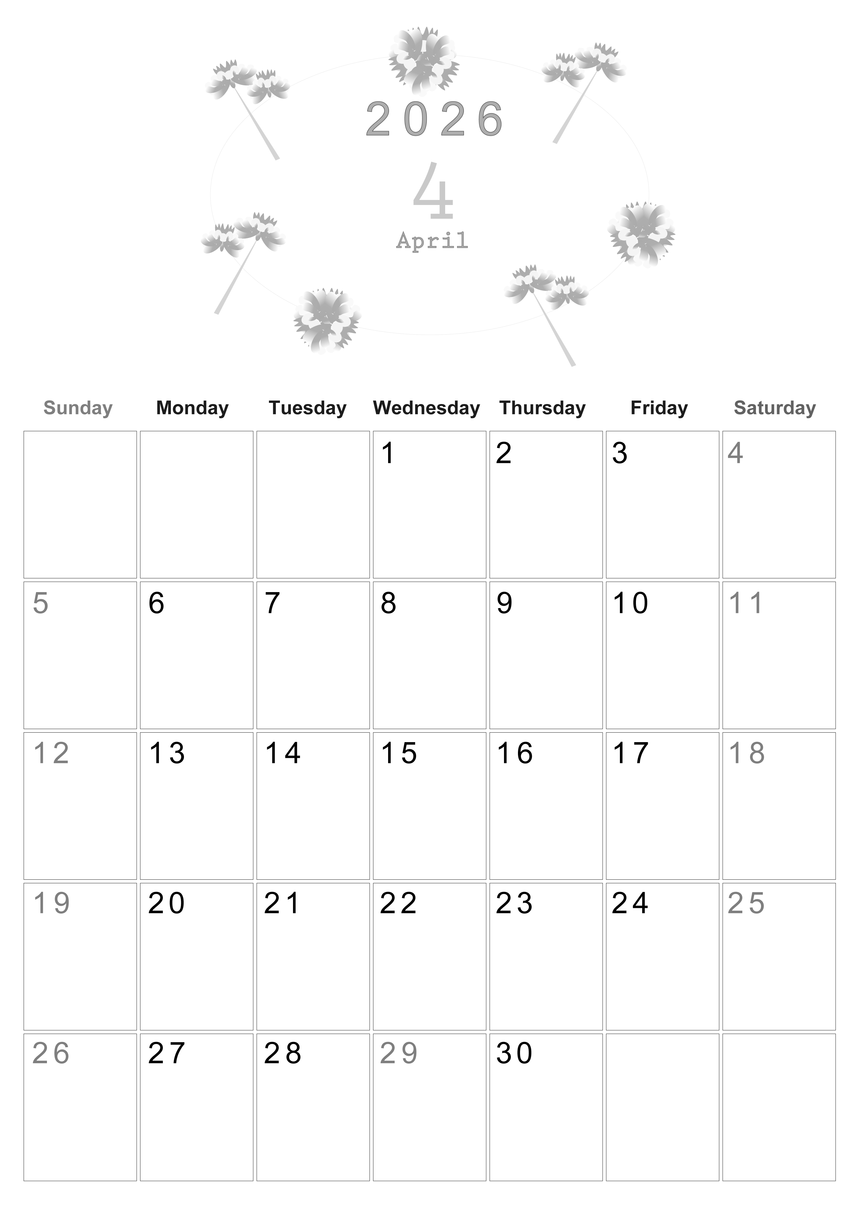 2026年4月縦型モノクロの日曜始まり 牡丹桜イラストのかわいいA4無料白黒カレンダー(2026-00370410)