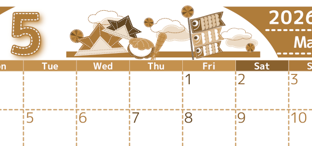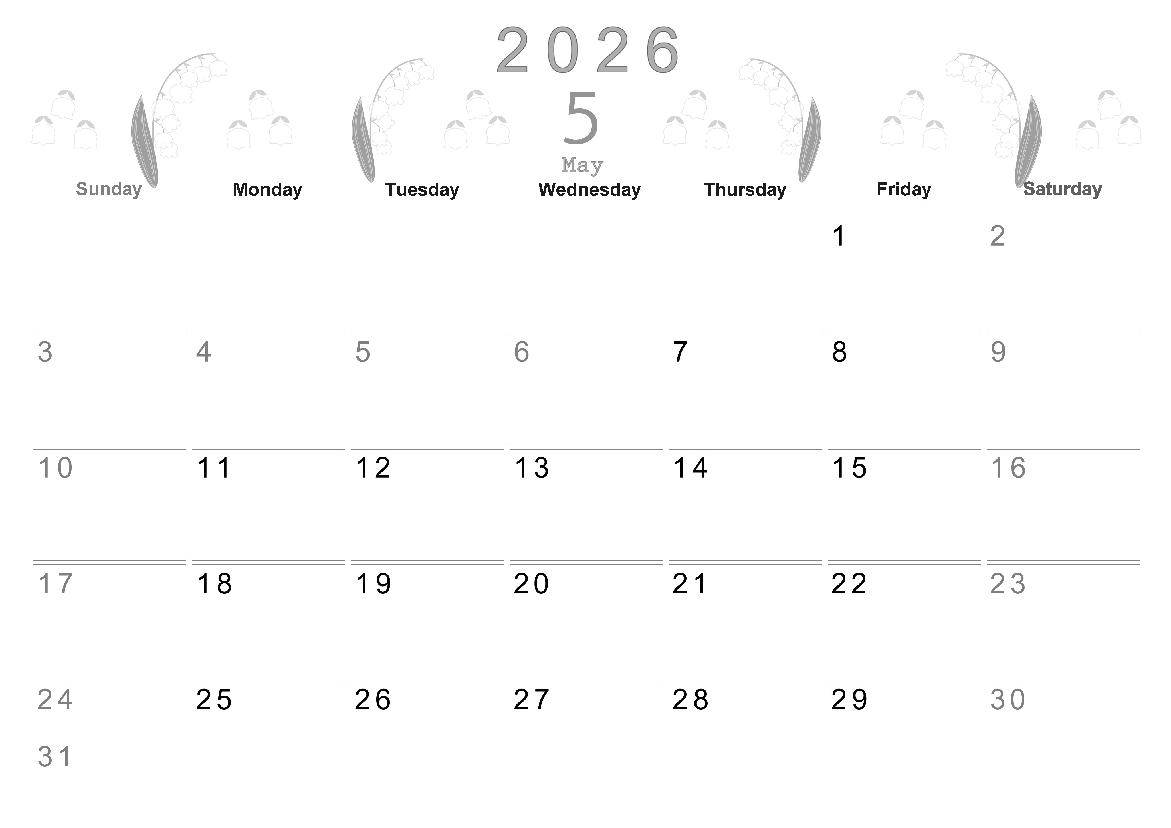 2026年5月横型モノクロの日曜始まりの無料テンプレート白黒カレンダーです。素朴でシンプルさが魅力的なすずらんのイラストが小ぶりでかわいいイラスト白黒カレンダーです。白紙に印刷する時にインクが少なくて済む経済的なデザインです。(2026-00370500)