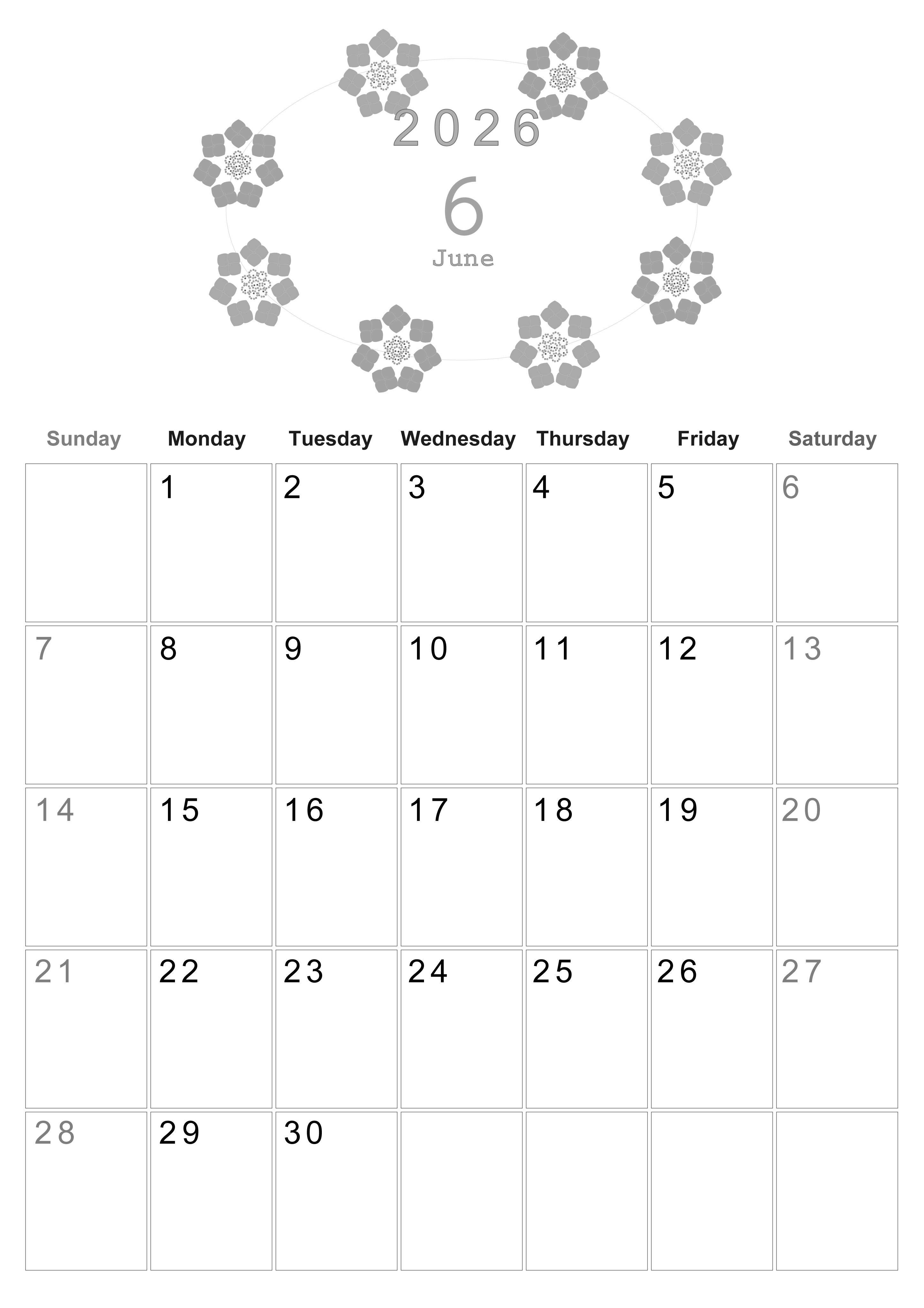 2026年6月縦型モノクロの日曜始まりの無料テンプレート白黒カレンダーです。あじさいのイラストが季節感を漂わせているかわいいデザインのプラン管理を積極的に進めたくなるような白黒カレンダー素材となっていてダウンロードは無料です。(2026-00370610)