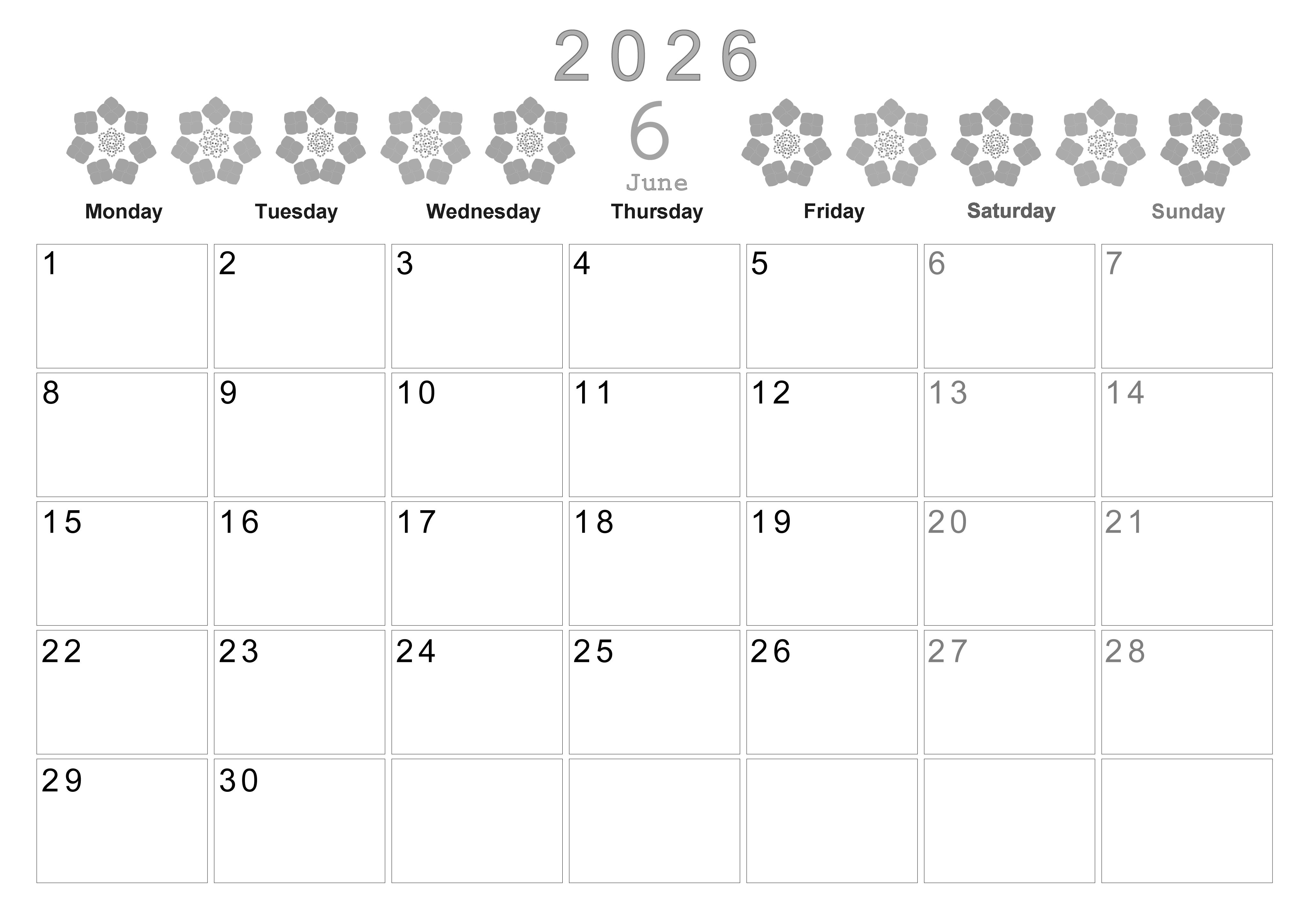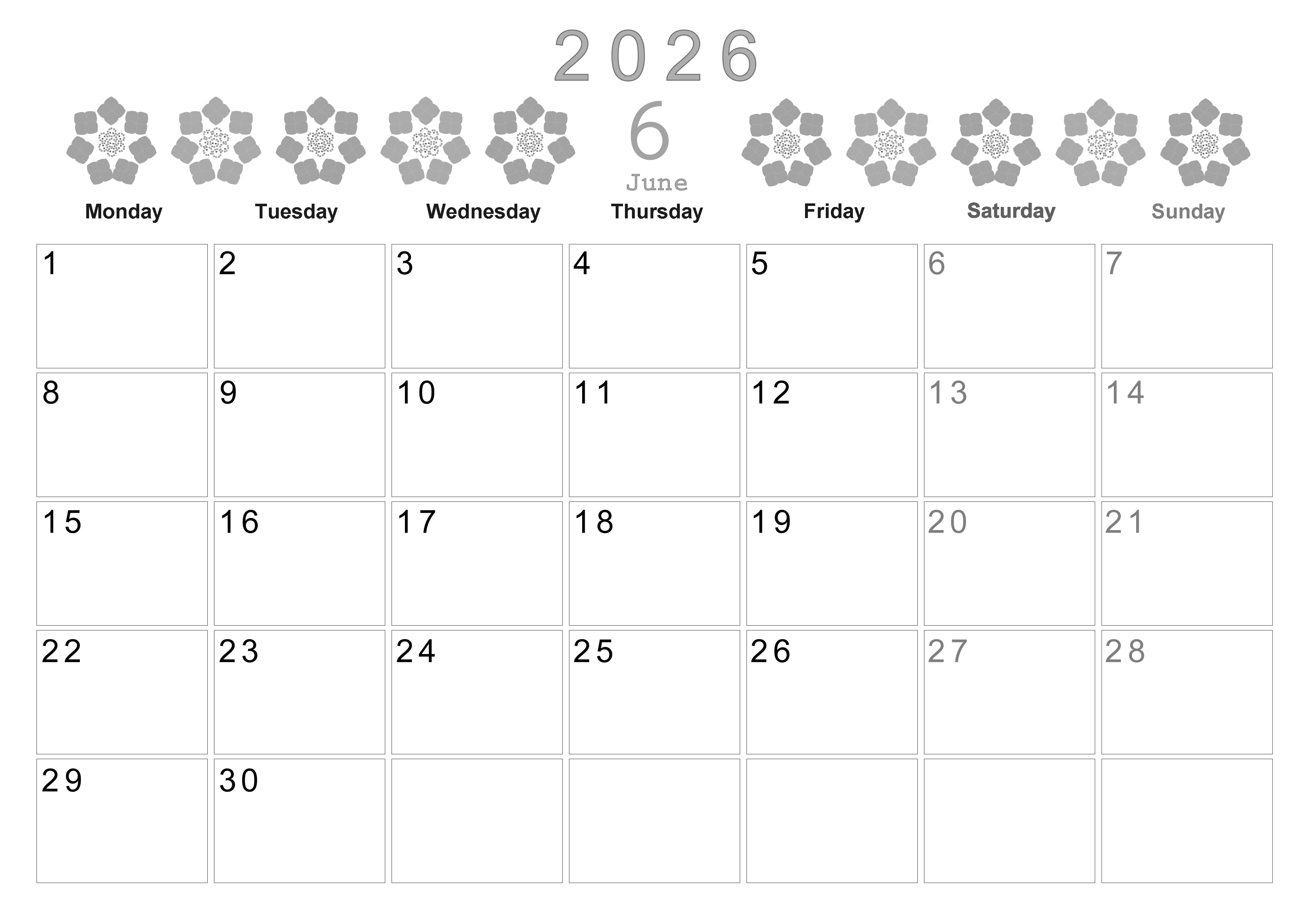2026年・無料のカレンダーテンプレート 2026年6月横型モノクロの月曜始まり あじさいイラストのかわいいA4無料白黒カレンダー(2026-00370601) 素材状デザイン王 2025年4月1日 2026年6月横型モノクロの月曜始まりの無料テンプレート白黒カレンダーです。大人っぽくてかわいいあじさいのイラストが上の方についている実用性の高いフォーマットの無料白黒カレンダーは月曜始まりです。(2026-00370601) 6月 横型のカレンダー 月曜始まり 白黒 カレンダーデザイン-0037