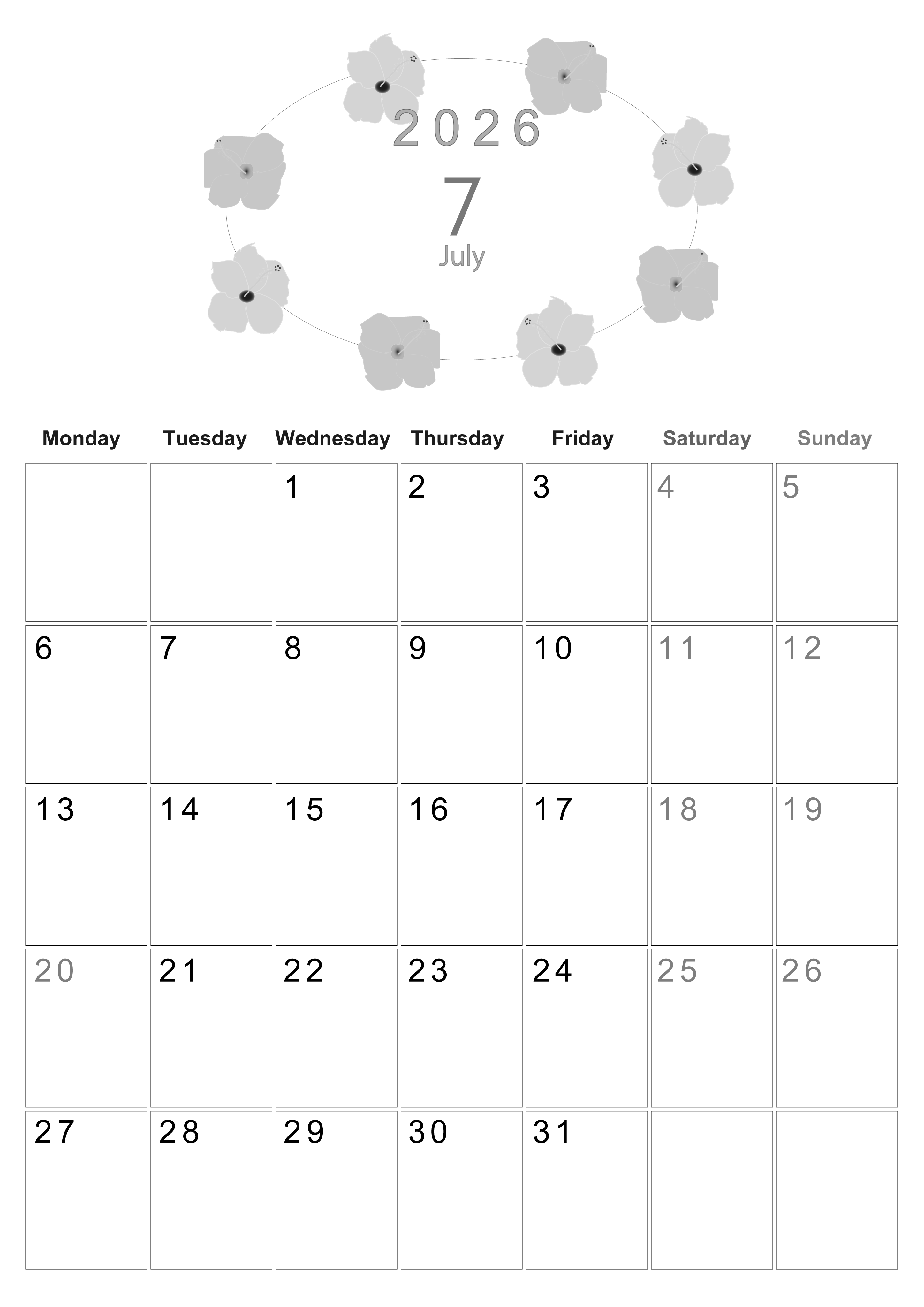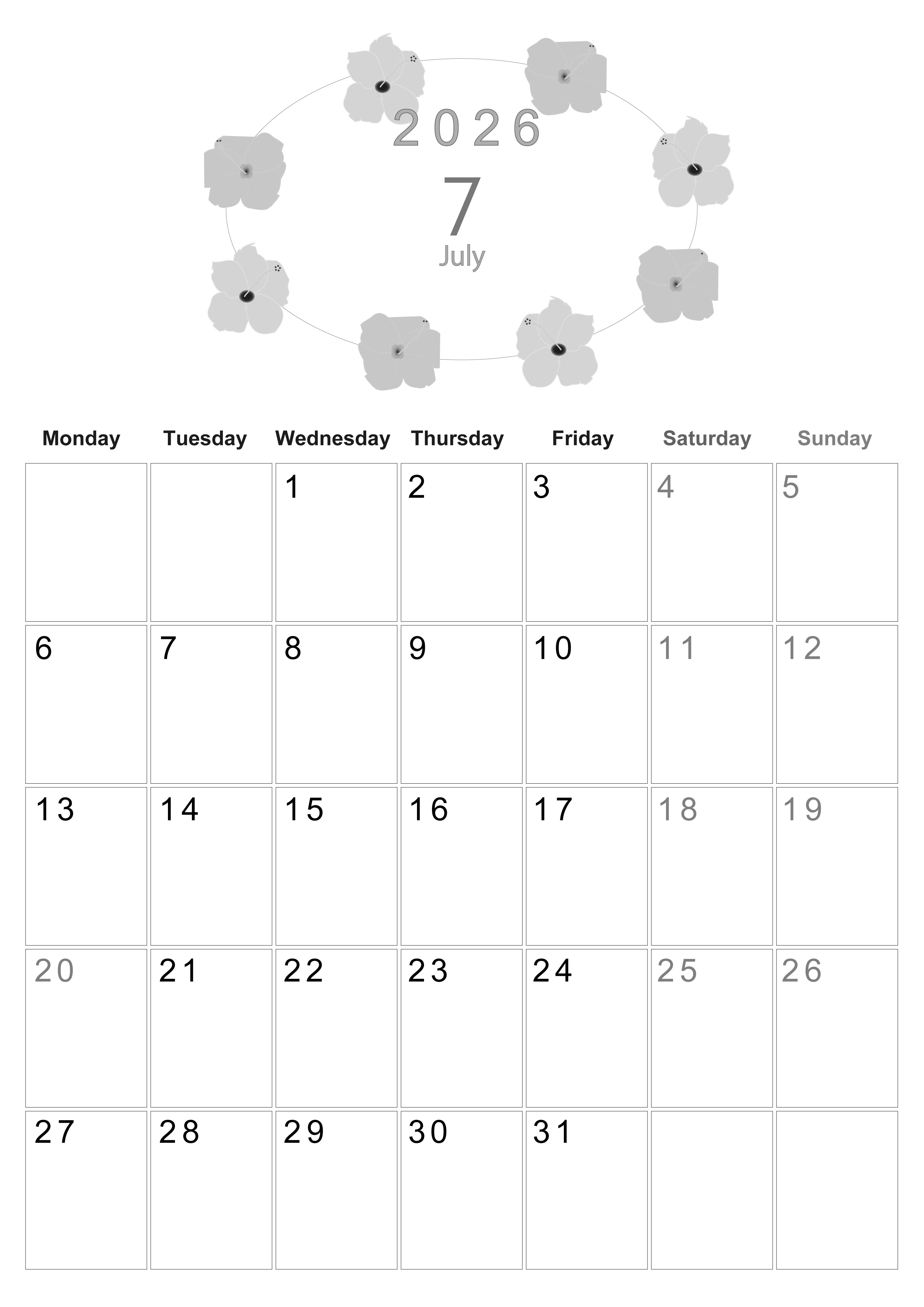 2026年7月縦型モノクロの月曜始まりの無料テンプレート白黒カレンダーです。月曜始まりでありながらも季節の花のイラストがかわいい完成度の高い白黒カレンダーは無料にてお気軽にダウンロード利用頂けます。(2026-00370711)