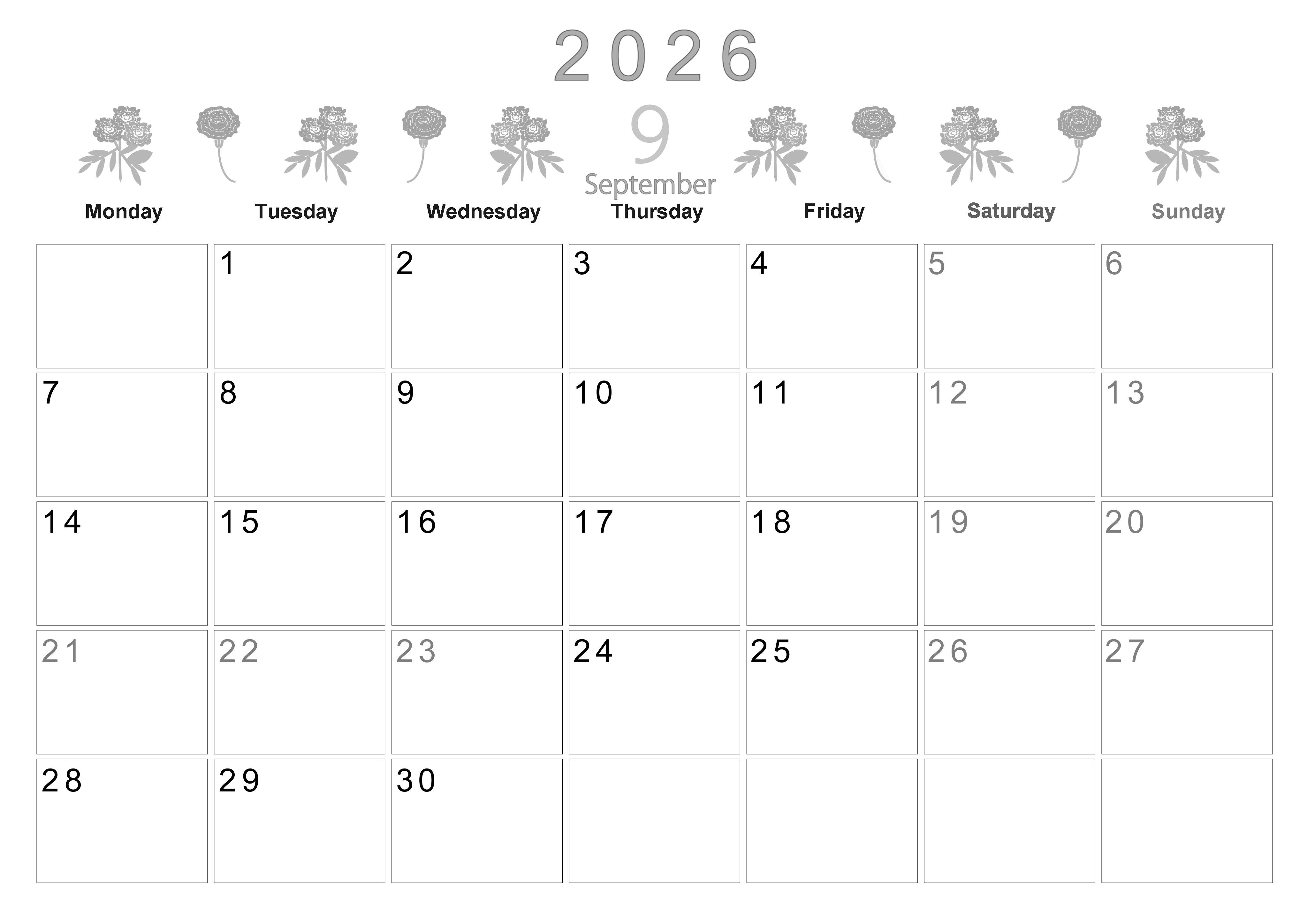 2026年9月横型モノクロの月曜始まりの無料テンプレート白黒カレンダーです。花のイラストがシンプルに小さく描かれたかわいいイラストです。かわいいのはもちろんですが月曜始まりなので実用性も高い便利な素材です。(2026-00370901)