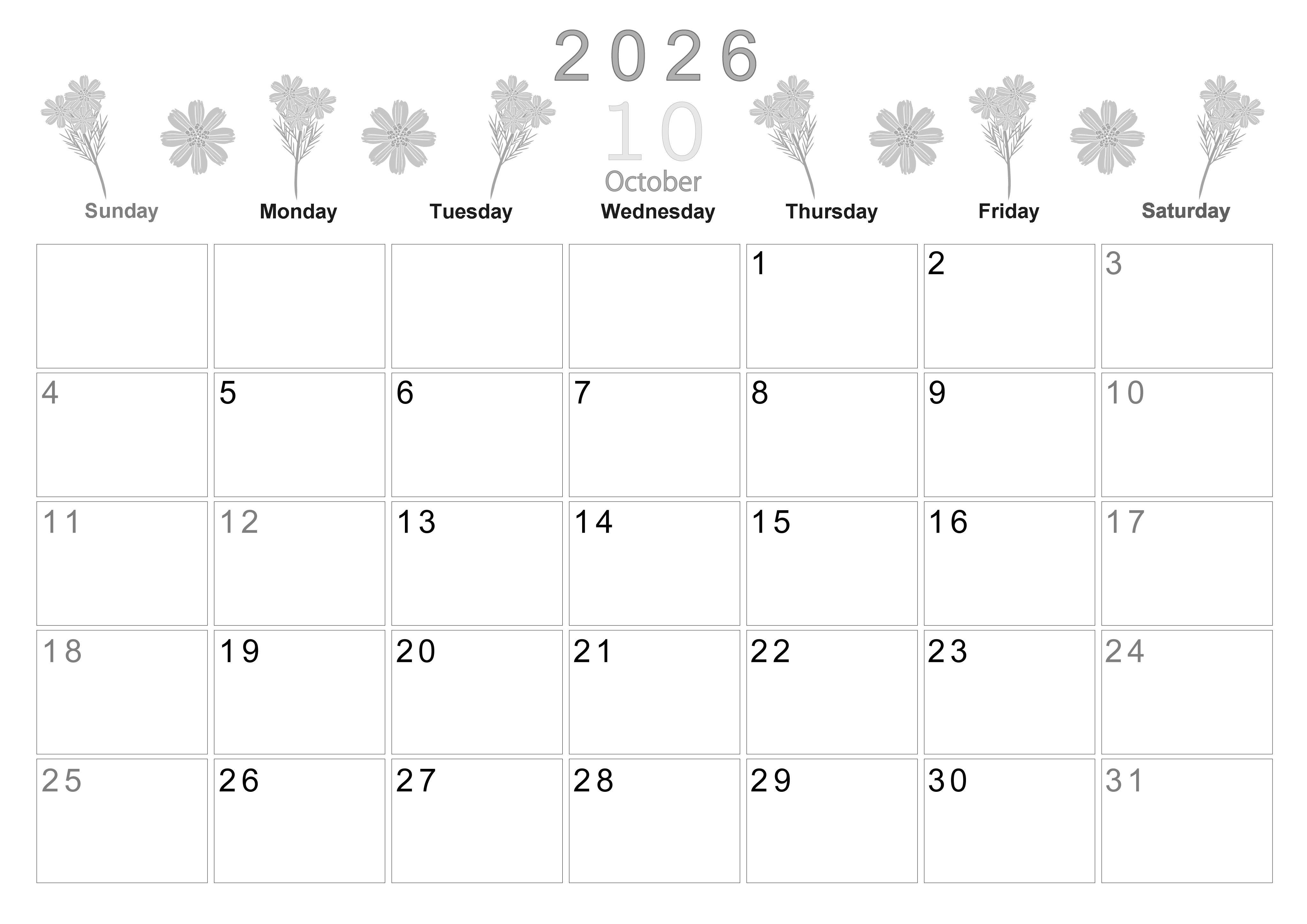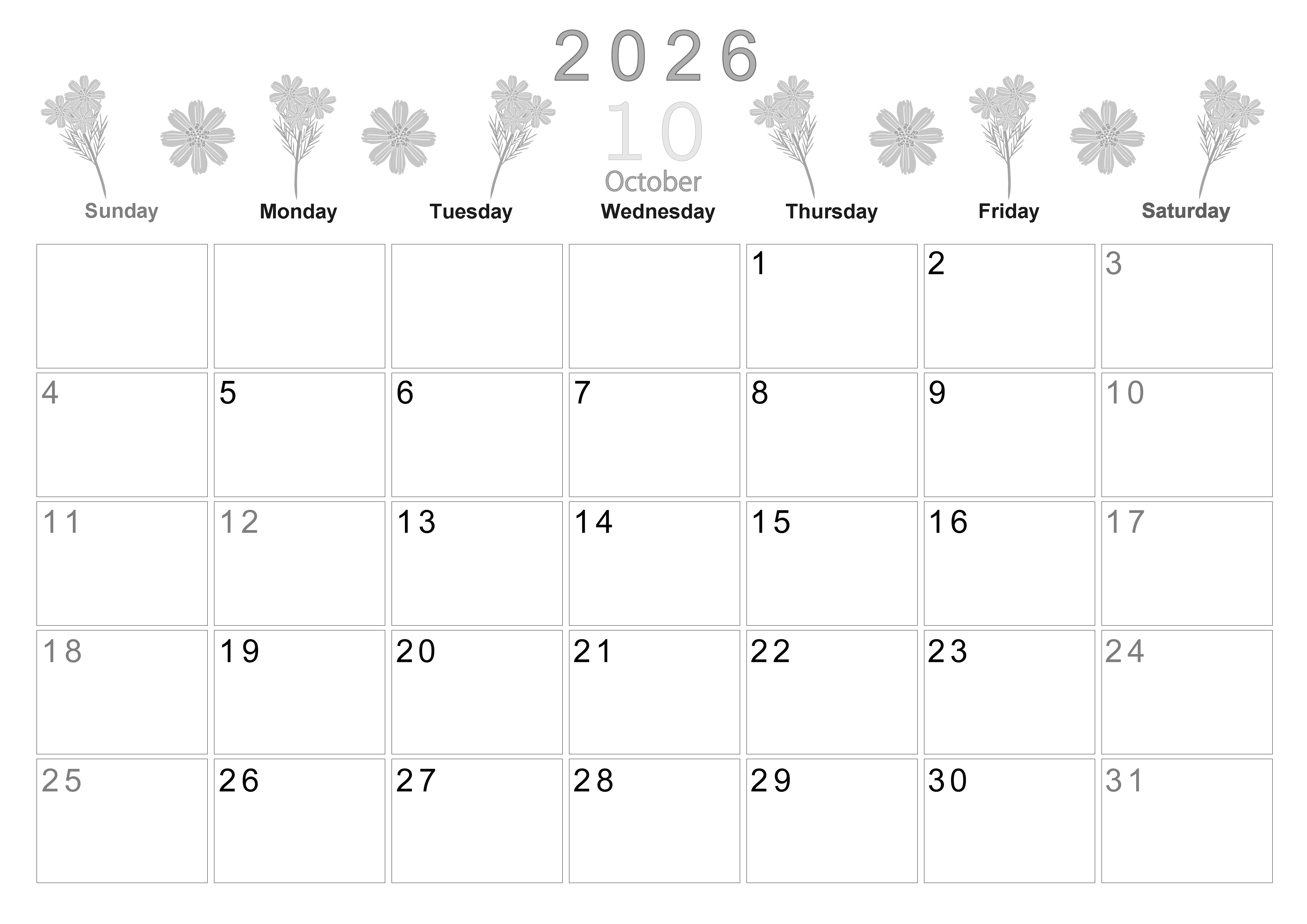 2026年10月横型モノクロの日曜始まり 花イラストのかわいいA4無料白黒カレンダー(2026-00371000)