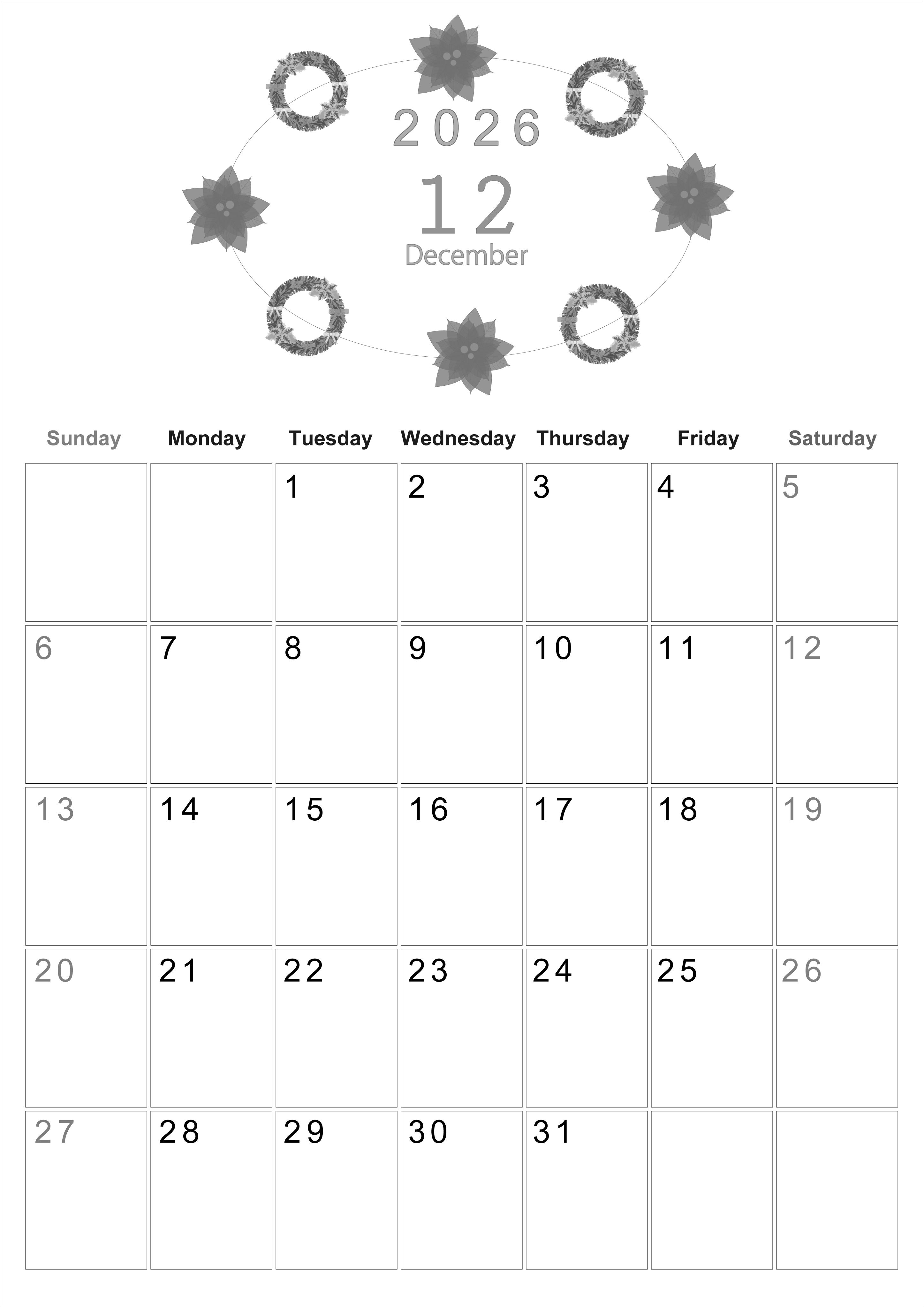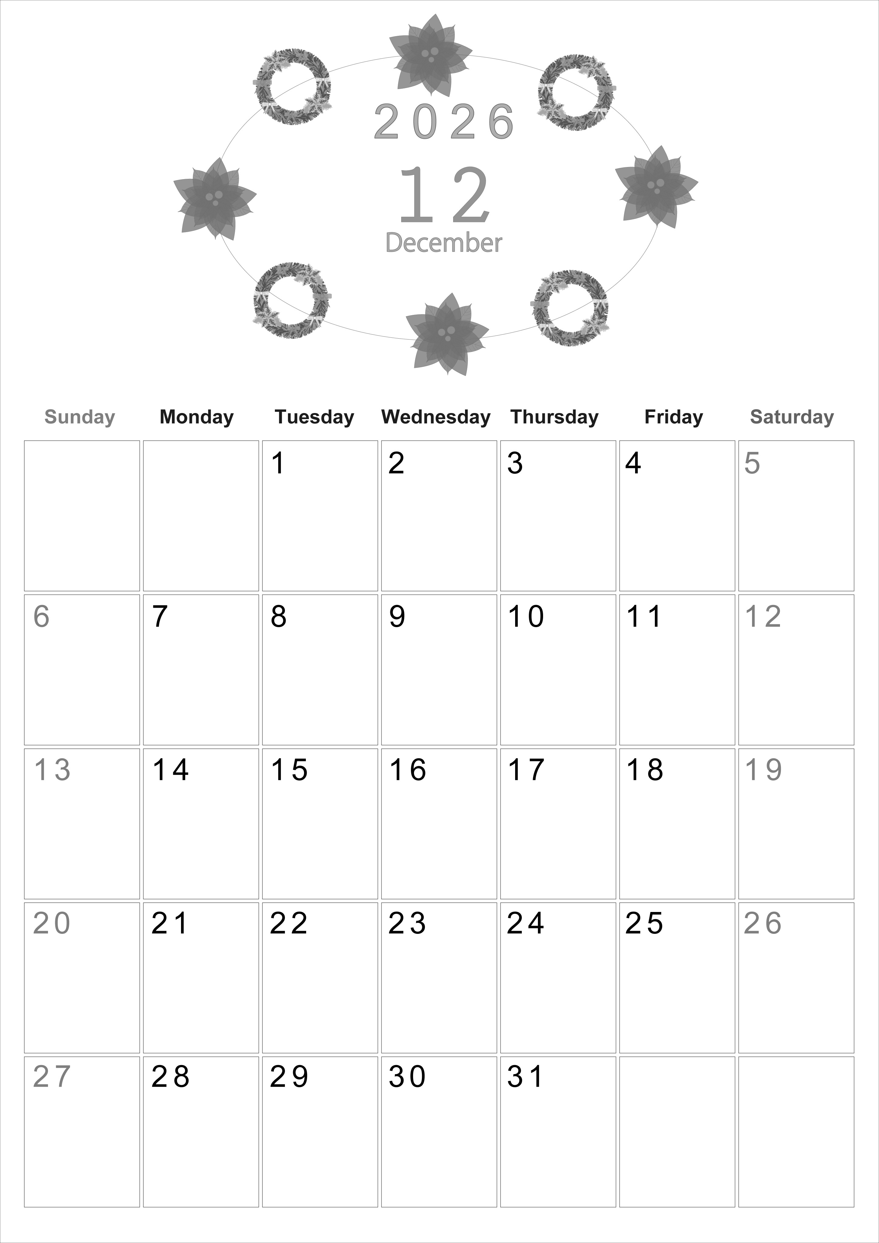 2026年12月縦型モノクロの日曜始まりの無料テンプレート白黒カレンダーです。ポインセチアがかわいいイラストです。白い部分もたっぷりあるのでインクの使いすぎを心配せずに安心して印刷が行えます。(2026-00371210)