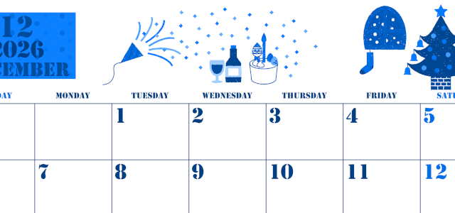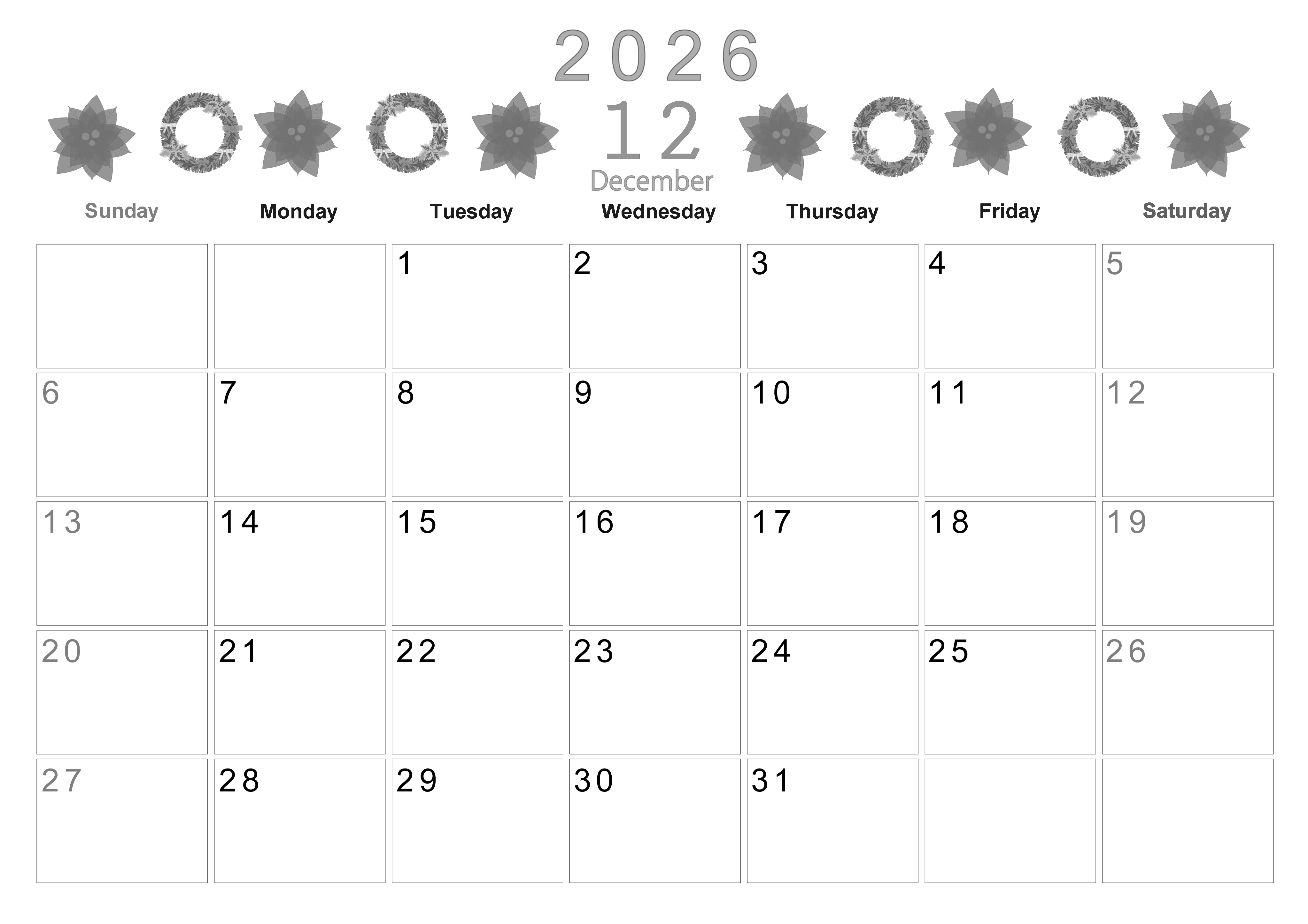 2026年12月横型モノクロの日曜始まりの無料テンプレート白黒カレンダーです。ポインセチアとクリスマスリースがウキウキマインドを刺激してくれるかわいいデザインのイラスト白黒カレンダーとなっています。(2026-00371200)