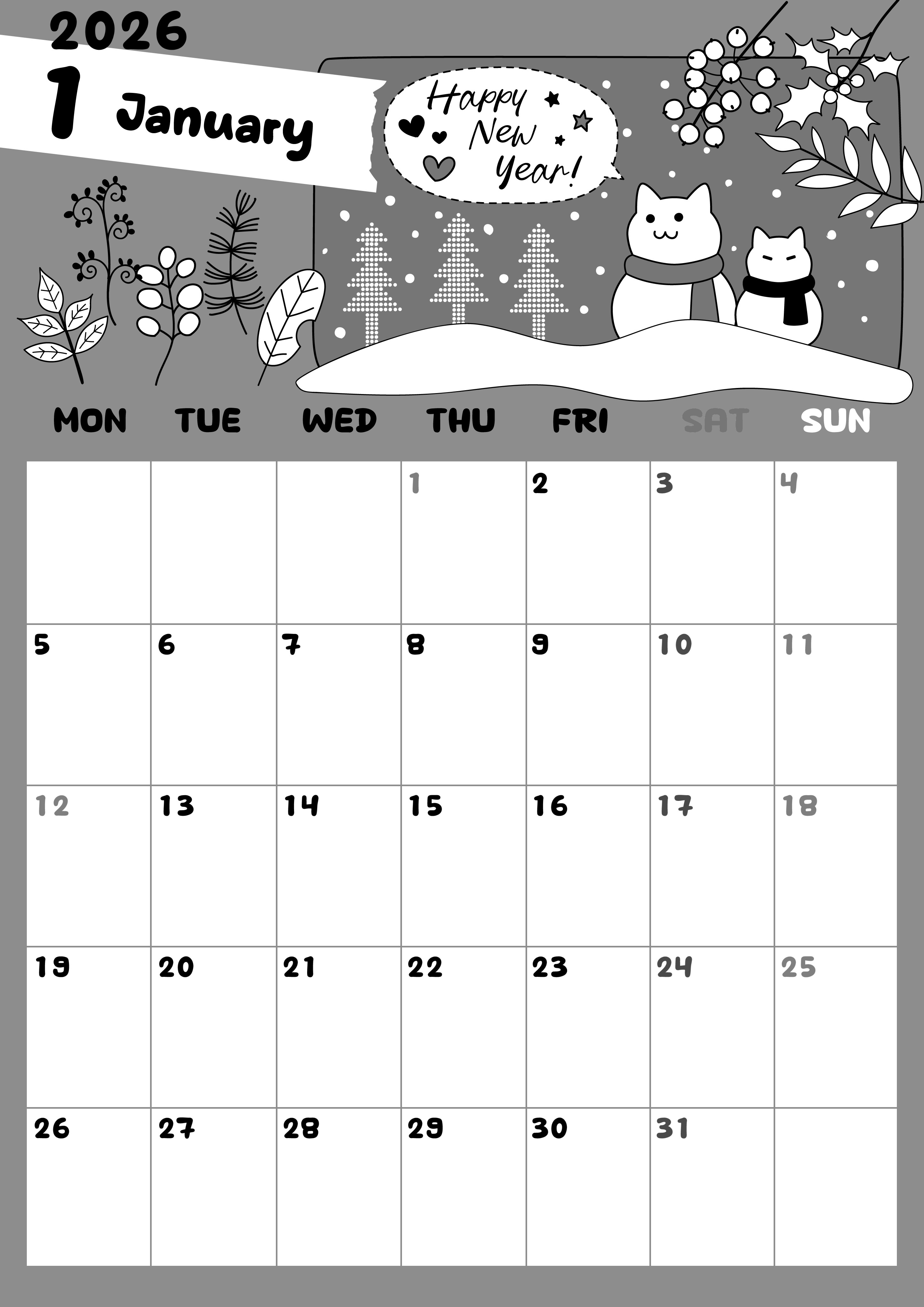 2026年1月縦型モノクロの月曜始まりです。全体的にエネルギッシュな色合いのポップなイラストが特徴の白黒カレンダーです。猫のカタチをした雪だるまが新年の挨拶をしているのもとってもかわいいフリー素材です。(2026-00380111)