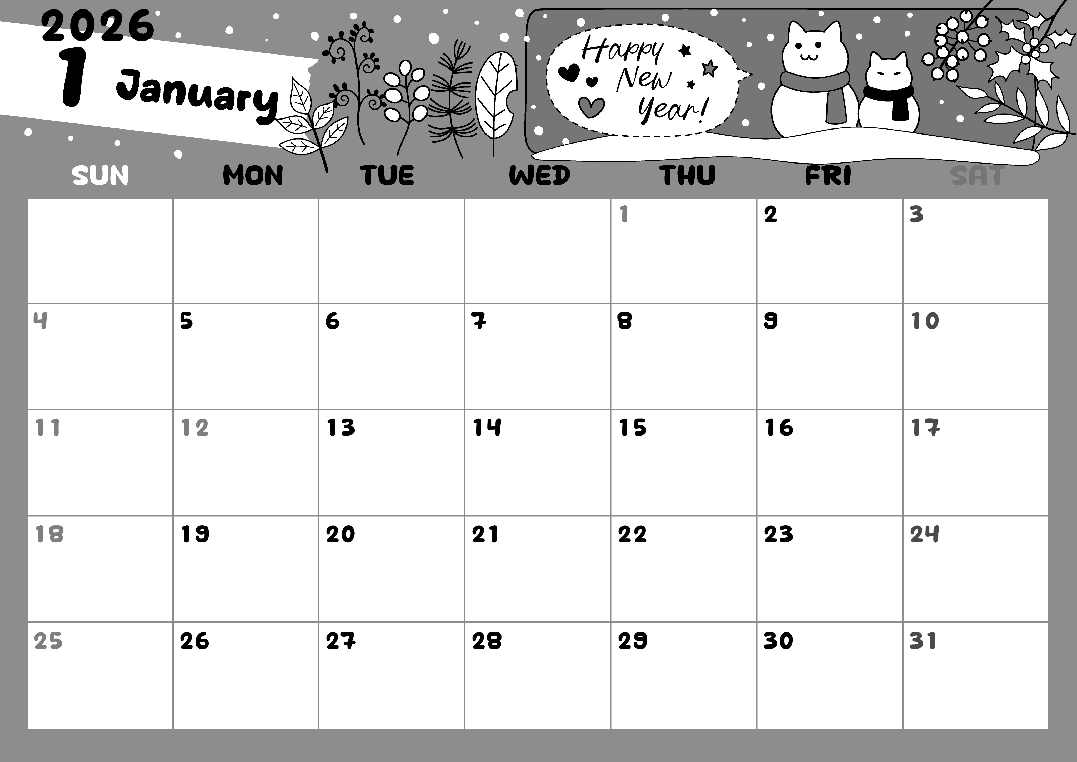 2026年1月横型モノクロの日曜始まりです。ボタニカルな草花がモノトーンで描かれている一方、枠部分の背景はビビッドなイエローとコントラストがはっきりとしたかわいい背景のオリジナル白黒カレンダーです。猫耳の雪だるまカップルがかわいいのがポイントです。(2026-00380100)