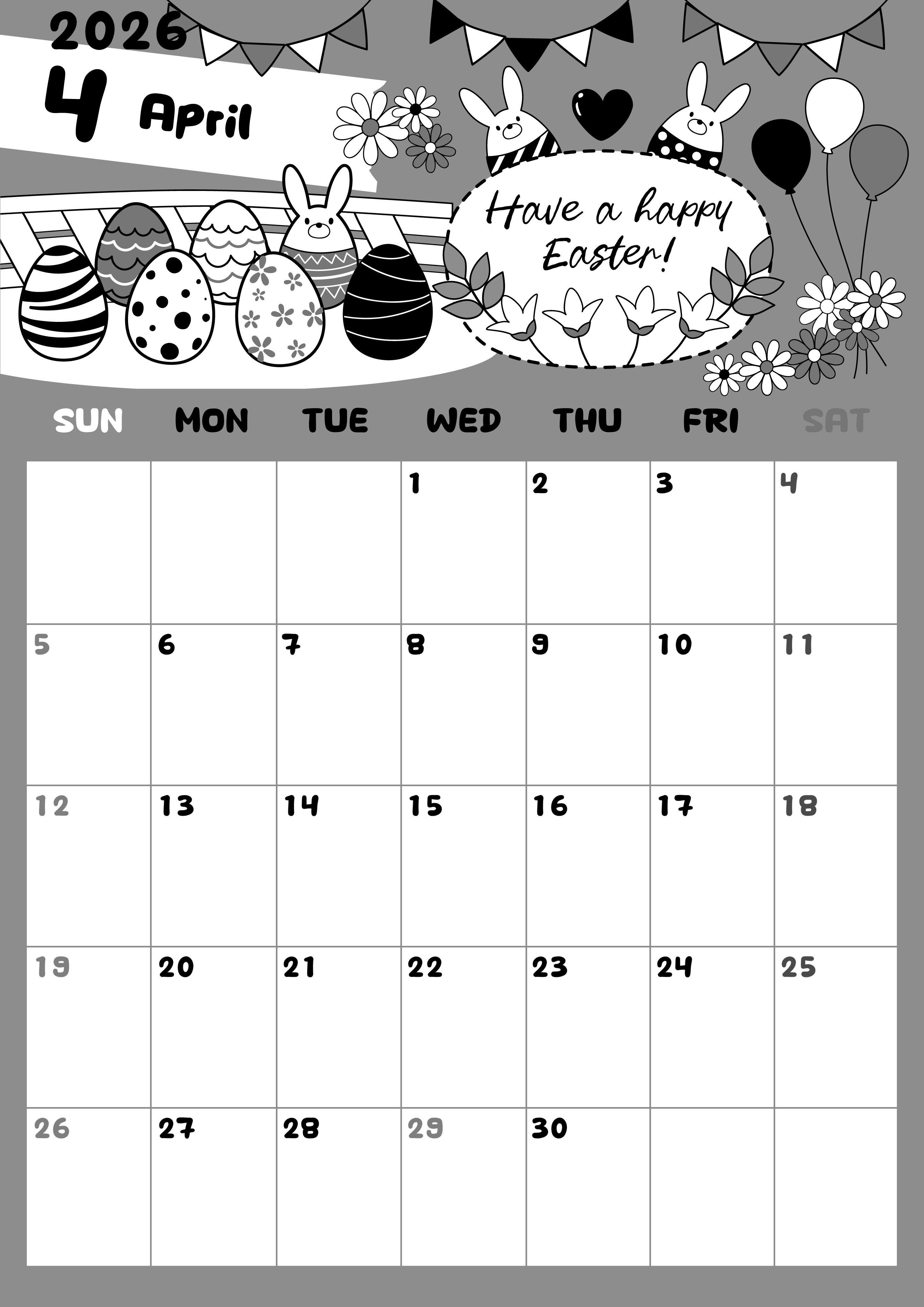 2026年4月縦型モノクロの日曜始まりの無料テンプレート白黒カレンダーです。ポップなうさぎとイースターエッグの組み合わせがかわいい白黒カレンダーです。イラストだけでなく予定を書き込む部分も見やすいようなフォーマットとなっています。(2026-00380410)