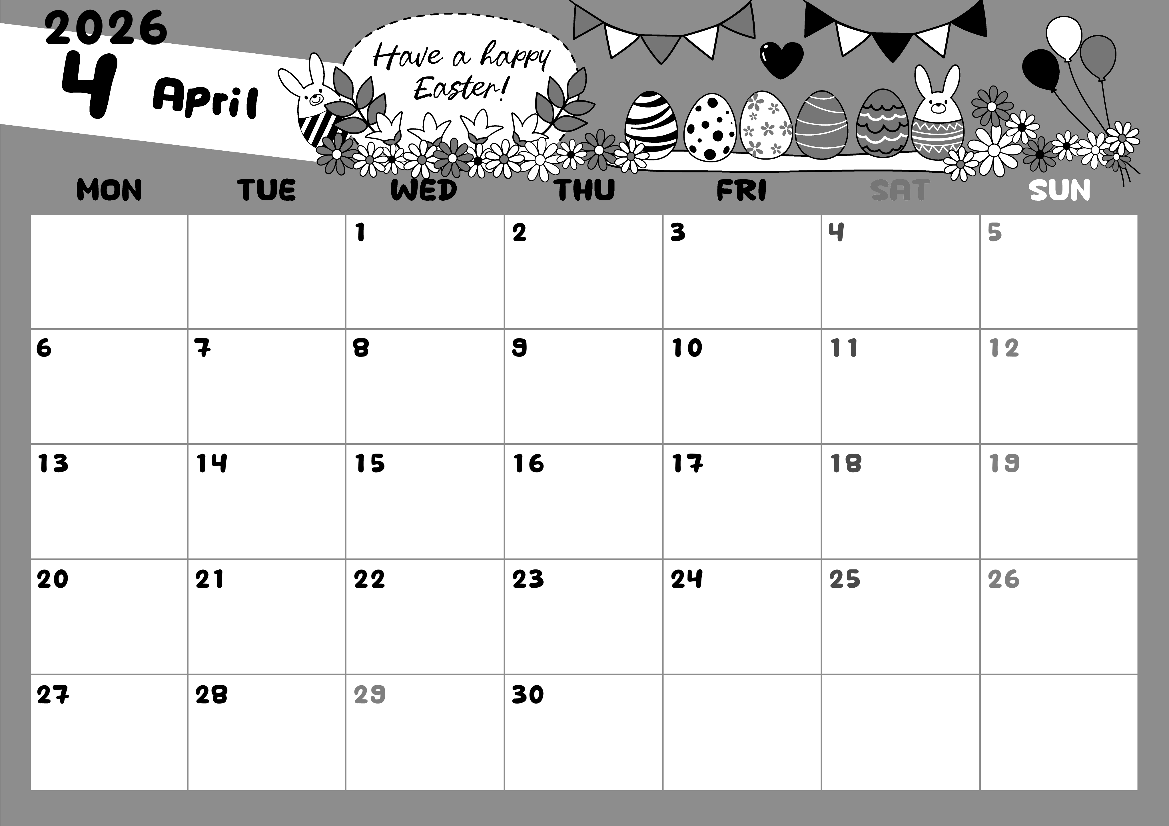 2026年4月横型モノクロの月曜始まりの無料テンプレート白黒カレンダーです。じっくりと見ていたいと思うような細部まで行き届いているかわいいイースターエッグのイラストをあしらった明るい白黒カレンダー素材です。(2026-00380401)