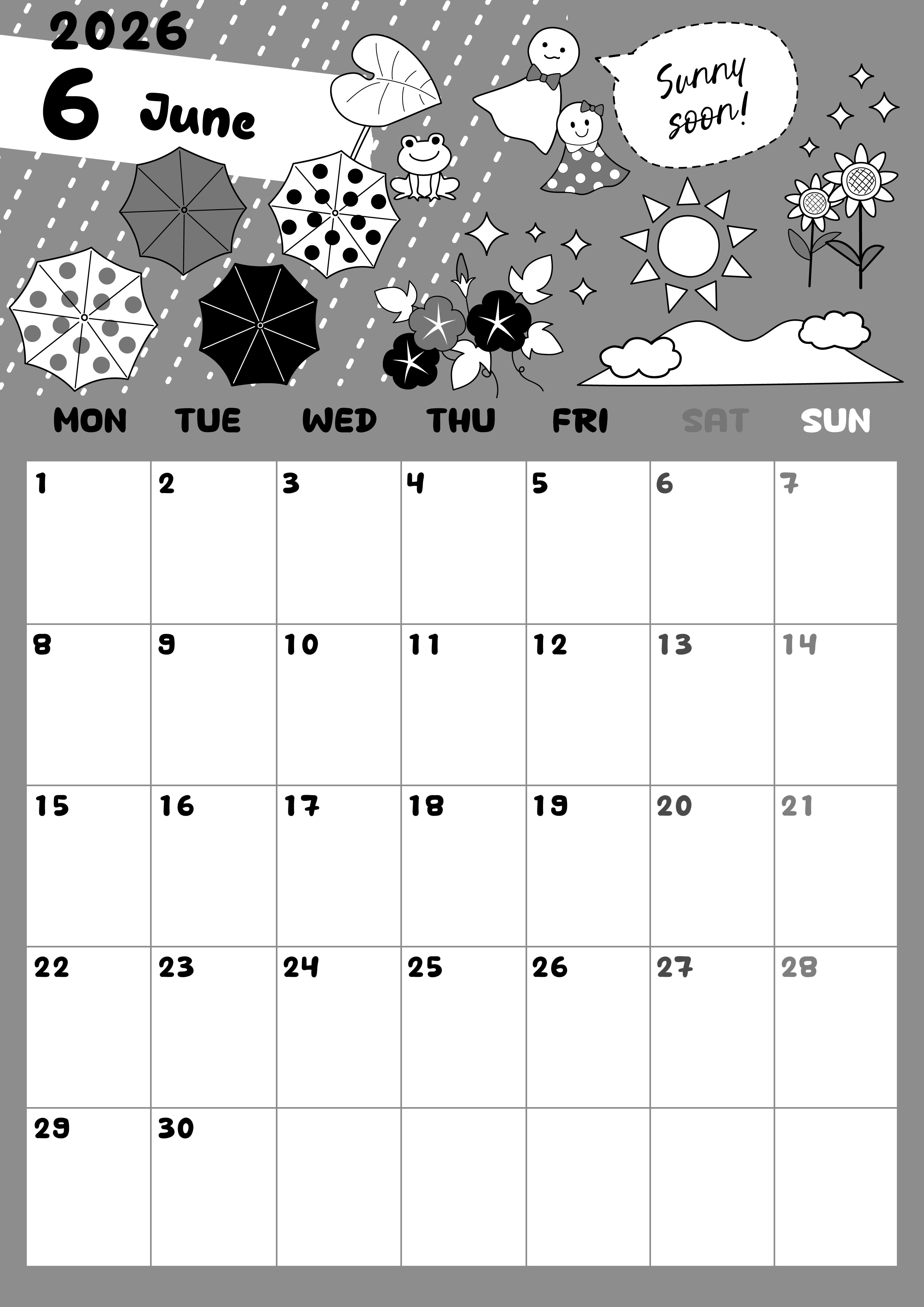 2026年6月縦型モノクロの月曜始まりの無料テンプレート白黒カレンダーです。白黒カレンダーは月曜始まりがいいという人におすすめの休みと平日の見分けがやりやすいかわいいイラスト白黒カレンダーとなっています。(2026-00380611)