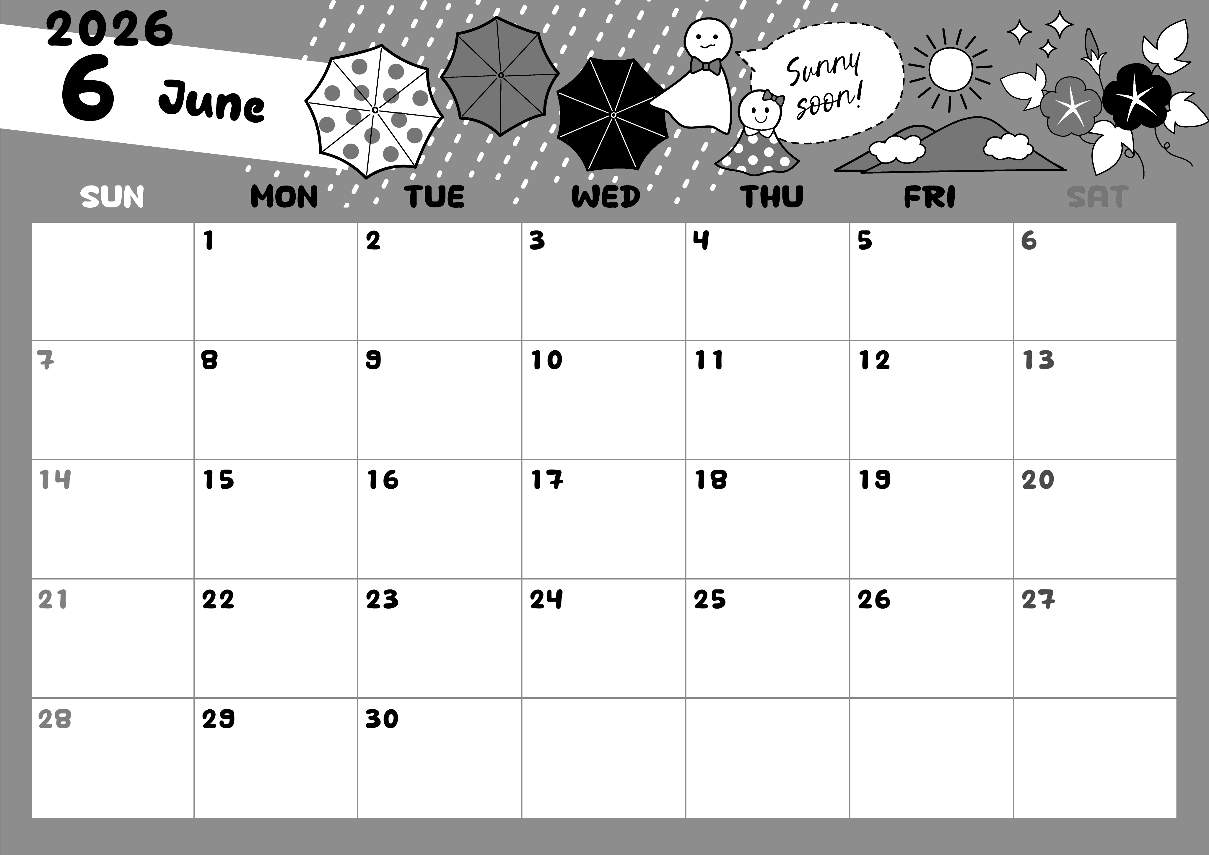 2026年6月横型モノクロの日曜始まりの無料テンプレート白黒カレンダーです。てるてる坊主や朝顔やパラソルといった6月の季節感をまとったフレームのポップでかわいい白黒カレンダーです。イラストも丁寧に描かれています。(2026-00380600)