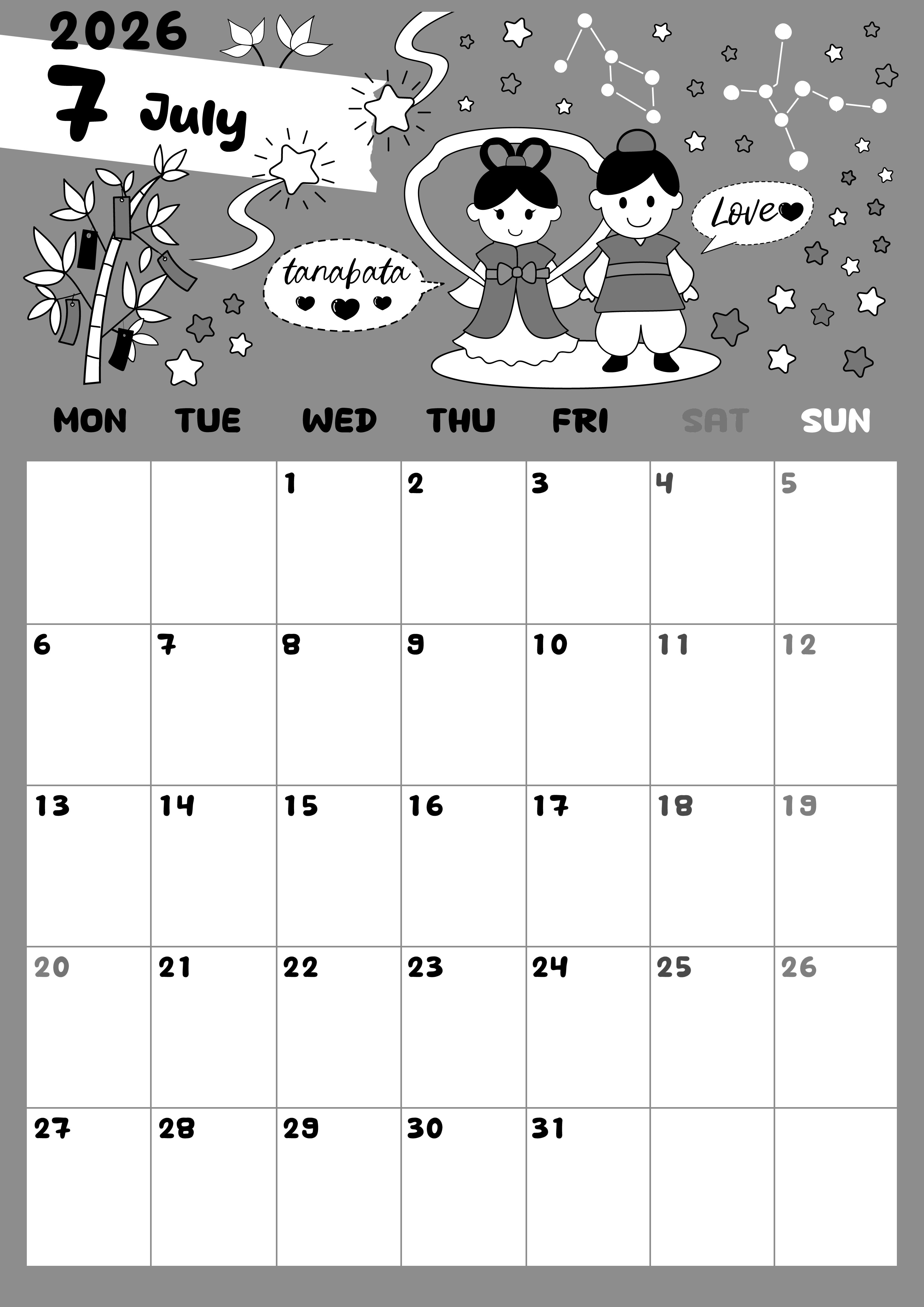 2026年7月縦型モノクロの月曜始まりの無料テンプレート白黒カレンダーです。月曜始まり白黒カレンダーなので勉強や仕事の把握がしやすいフォーマットです。イラストはポップでかわいいです。(2026-00380711)