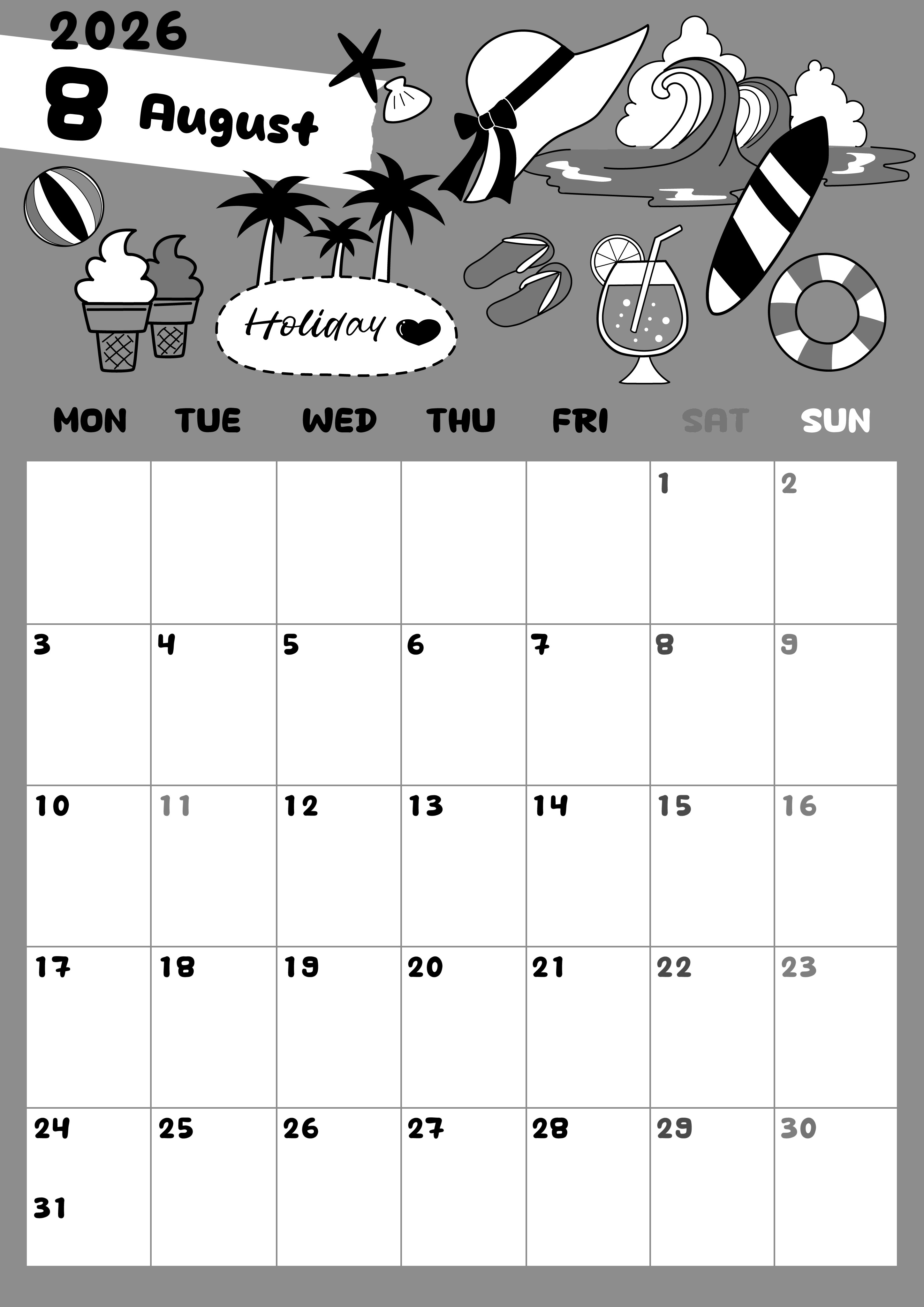 2026年8月縦型モノクロの月曜始まりの無料テンプレート白黒カレンダーです。月曜始まりで罫線も引いてある使い勝手の良い白黒カレンダーには海岸の賑やかな雰囲気が伝わってくるようなかわいいポップなイラストが目白押しです。(2026-00380811)
