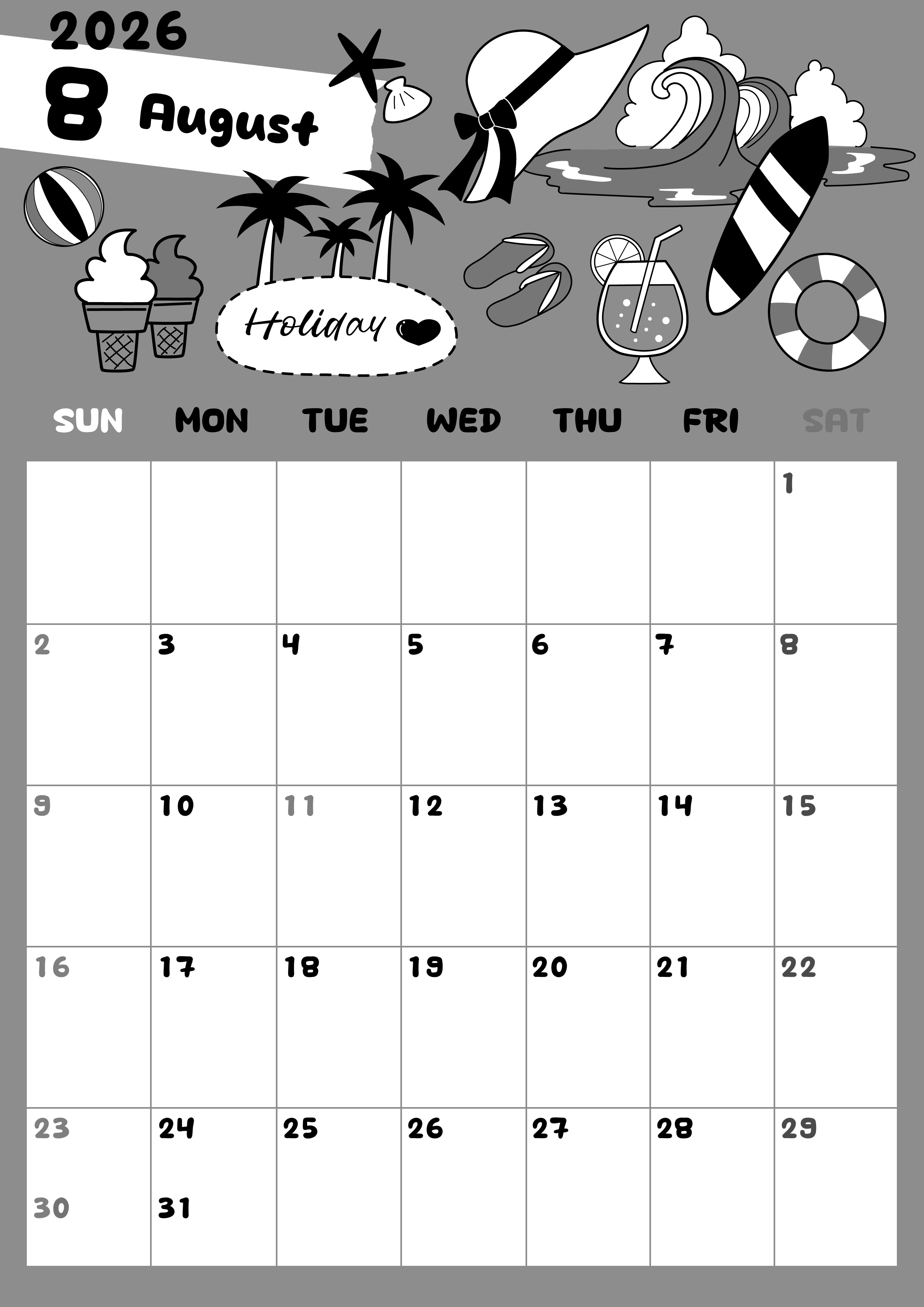 2026年・無料のカレンダーテンプレート 2026年8月縦型モノクロの日曜始まり 海岸イラストのかわいいA4無料白黒カレンダー(2026-00380810) 素材状デザイン王 2025年4月1日 2026年8月縦型モノクロの日曜始まりの無料テンプレート白黒カレンダーです。夏休みの海岸のバケーション感を表現したイラストがポップでかわいい白黒カレンダーです。元気が出そうです。(2026-00380810) 8月 縦型のカレンダー 日曜始まり 白黒 カレンダーデザイン-0038