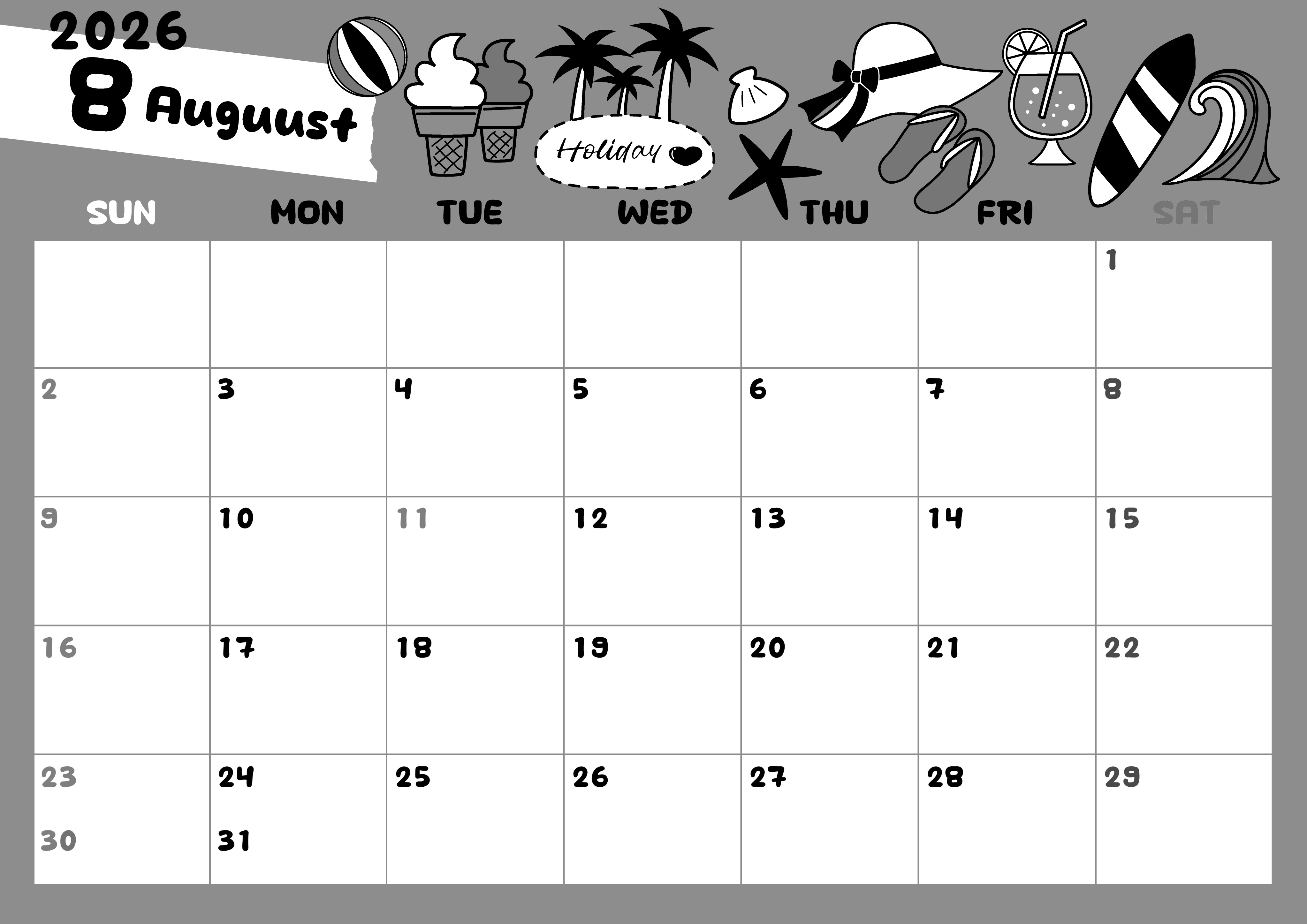 2026年8月横型モノクロの日曜始まりの無料テンプレート白黒カレンダーです。夏休みに海岸で日向ぼっこをしたり海水浴をしたりしたくなるようなポップで元気いっぱいのかわいいイラスト白黒カレンダーとなっています。(2026-00380800)
