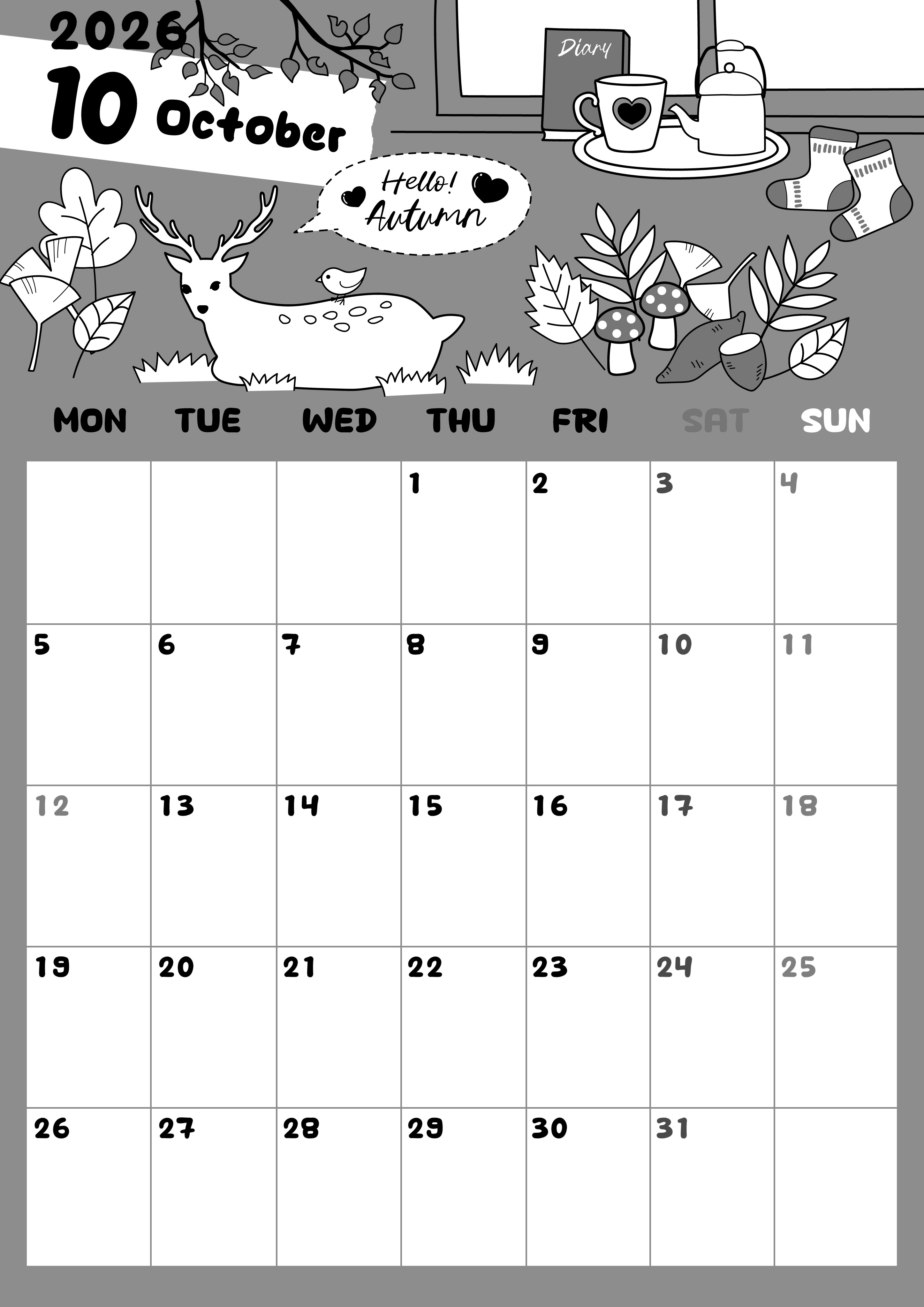 2026年・無料のカレンダーテンプレート 2026年10月縦型モノクロの月曜始まり 鹿のイラストがかわいいA4無料白黒カレンダー(2026-00381011) 素材状デザイン王 2025年4月1日 2026年10月縦型モノクロの月曜始まりの無料テンプレート白黒カレンダーです。鹿がカフェや紅葉の横に配置されていておしゃれな秋の過ごし方を彷彿とさせるかわいいイラストに仕上げました。金運もアップ!(2026-00381011) 10月 縦型のカレンダー 月曜始まり 白黒 カレンダーデザイン-0038