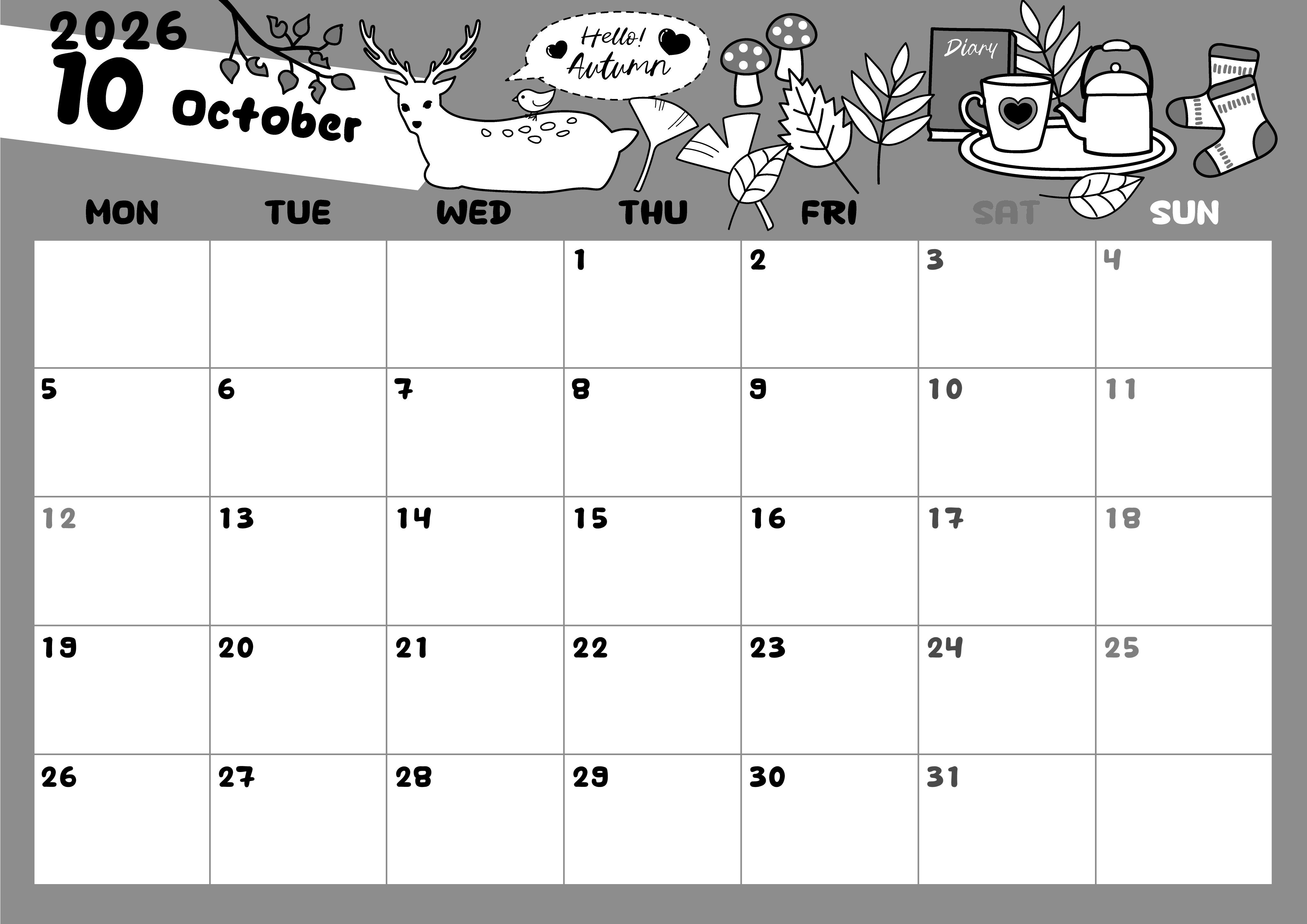 2026年・無料のカレンダーテンプレート 2026年10月横型モノクロの月曜始まり 鹿のイラストがかわいいA4無料白黒カレンダー(2026-00381001) 素材状デザイン王 2025年4月1日 2026年10月横型モノクロの月曜始まりの無料テンプレート白黒カレンダーです。1匹の鹿がのっそりと座ってこっちを見ている様子のイラストがかわいいです。金運アップも期待できる白黒カレンダーです。(2026-00381001) 10月 横型のカレンダー 月曜始まり 白黒 カレンダーデザイン-0038