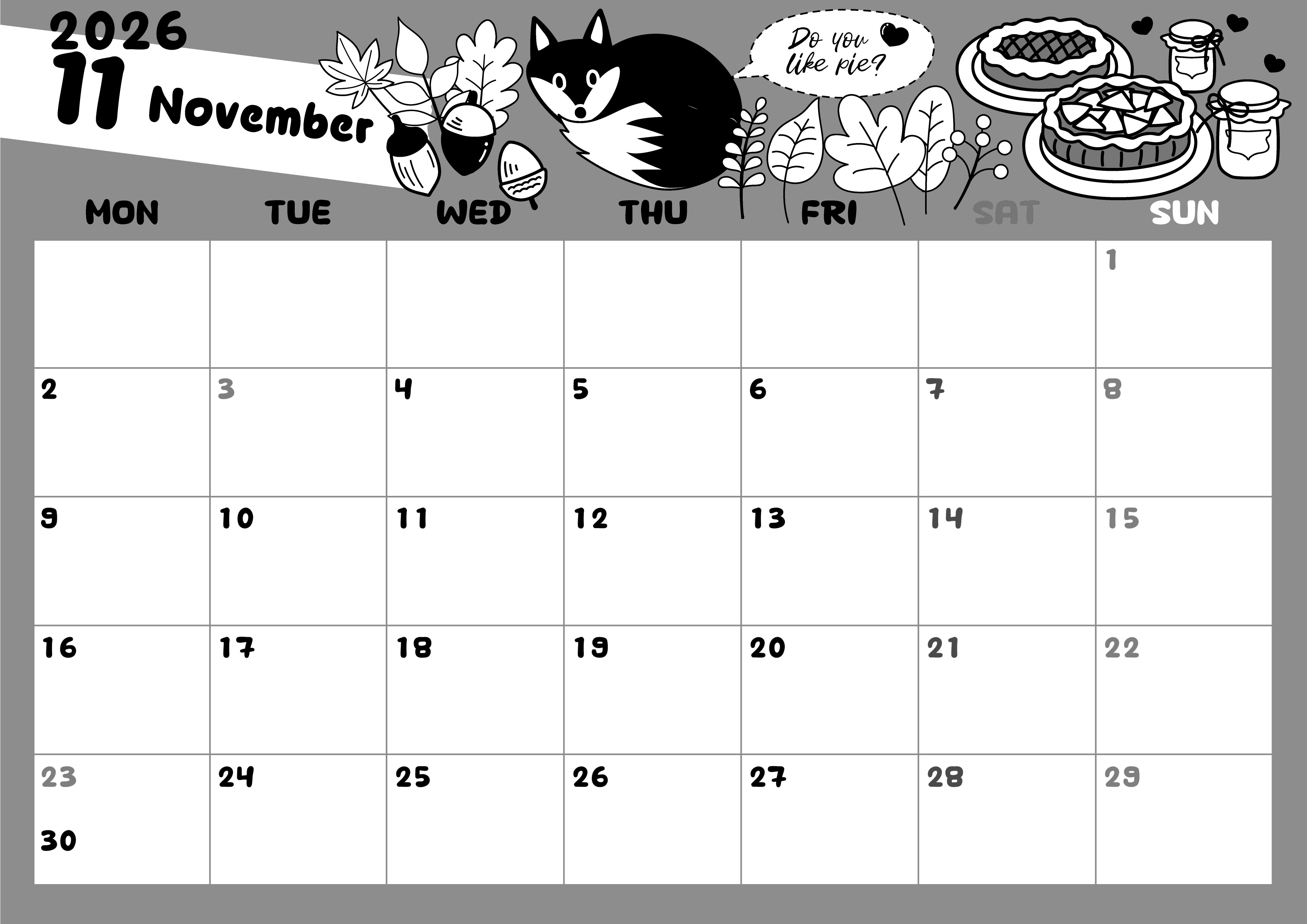 2026年11月横型モノクロの月曜始まりの無料テンプレート白黒カレンダーです。食欲の秋に食べたくなるようなアップルパイのイラストが右上に施されていて全体的に使っているので金運にも良いデザインとなっています。(2026-00381101)